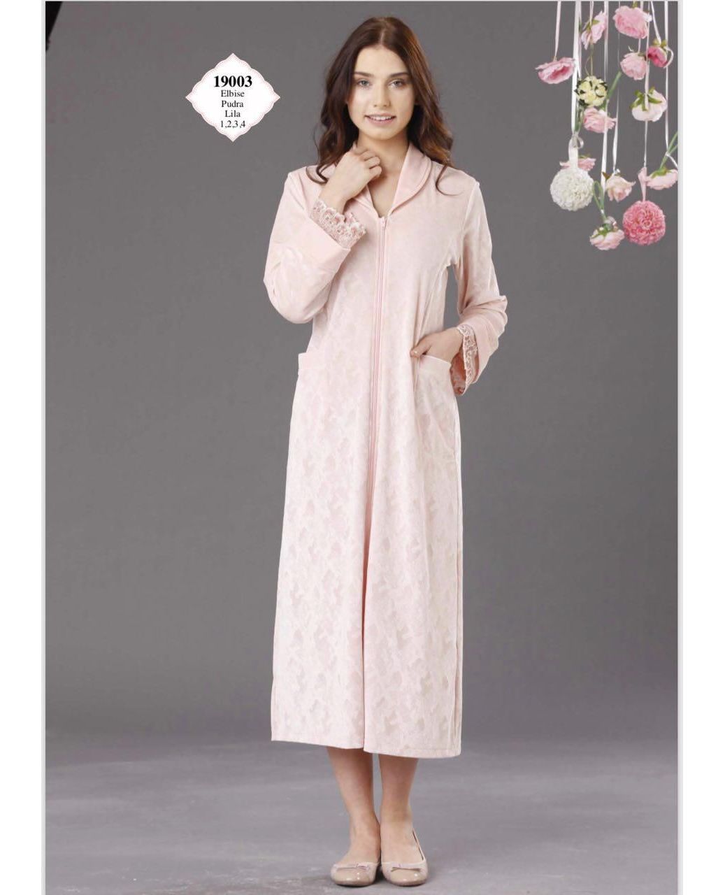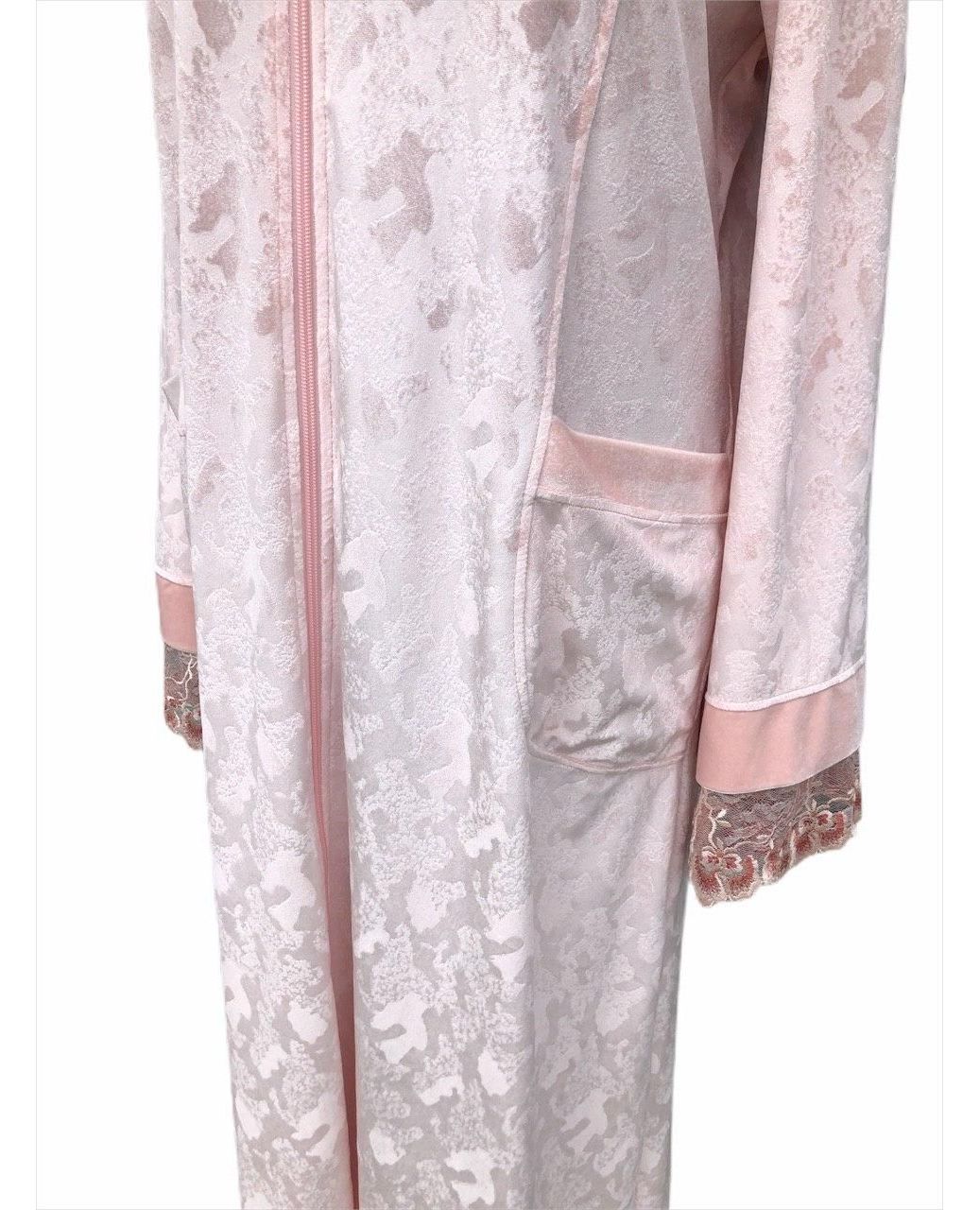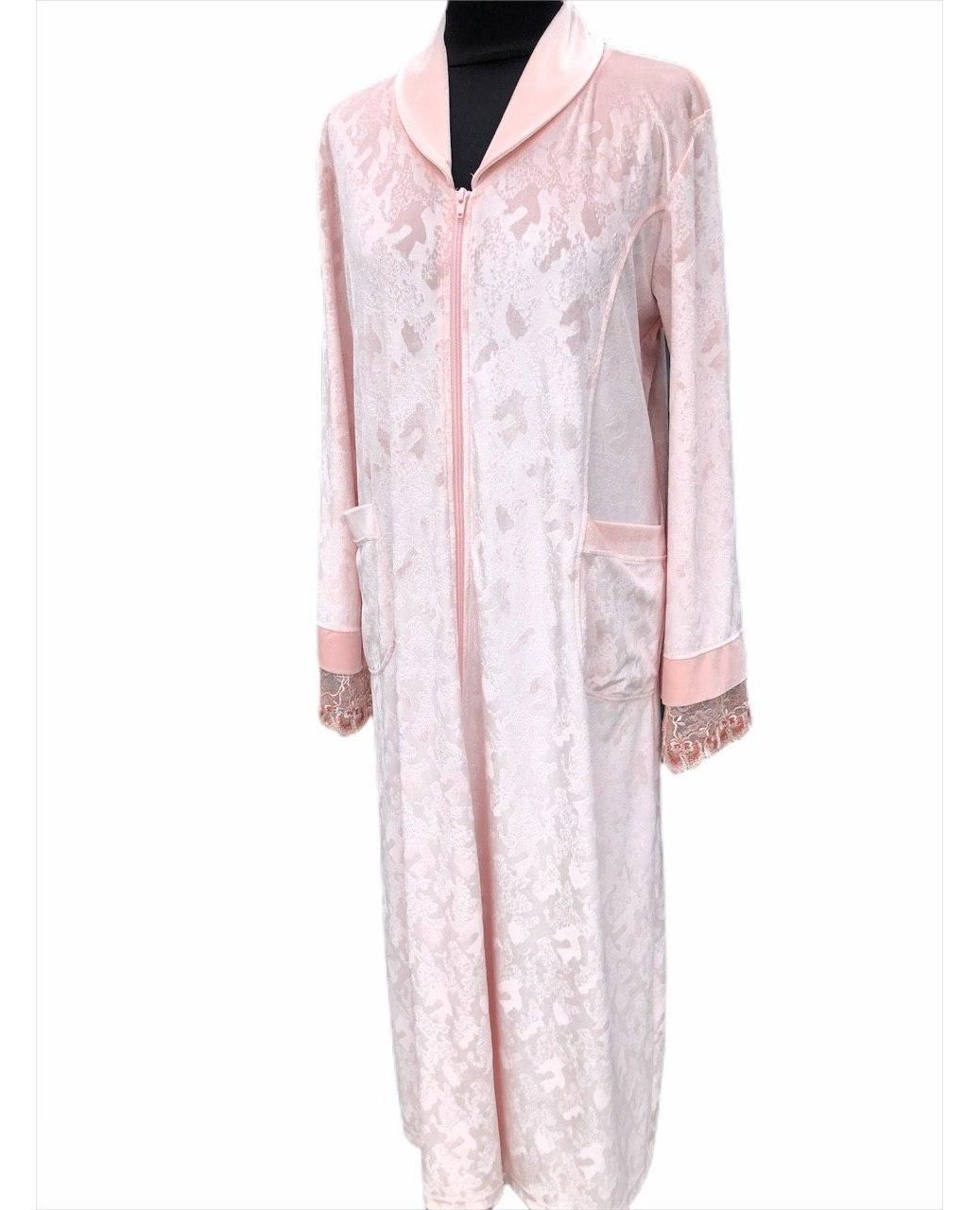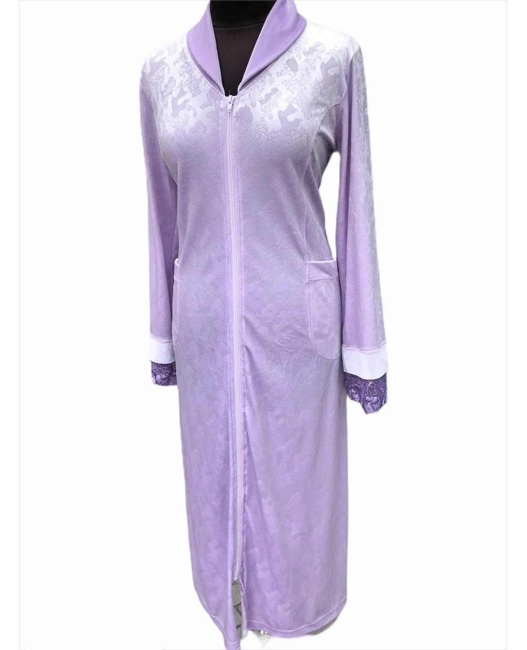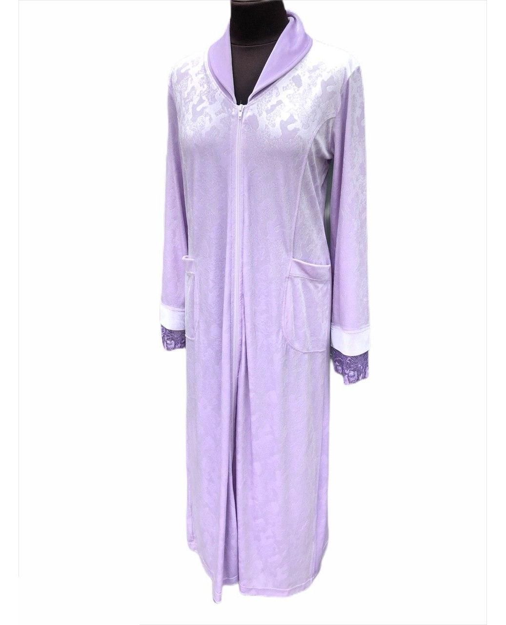 Женский халат на молнии, доступный в двух цветах: фиолетовом и пудровом. Модель украшена изящным кружевом, которое придаёт образу элегантность и женственность. Мягкая и эластичная ткань приятна к телу, хорошо сидит по фигуре и обеспечивает комфорт при домашнем ношении.