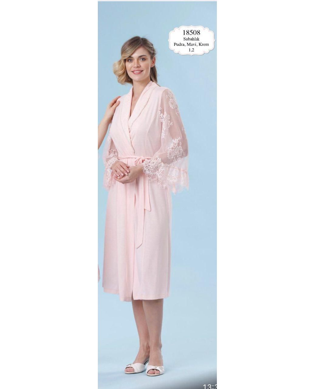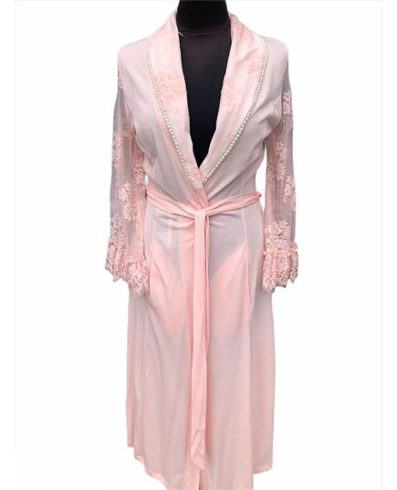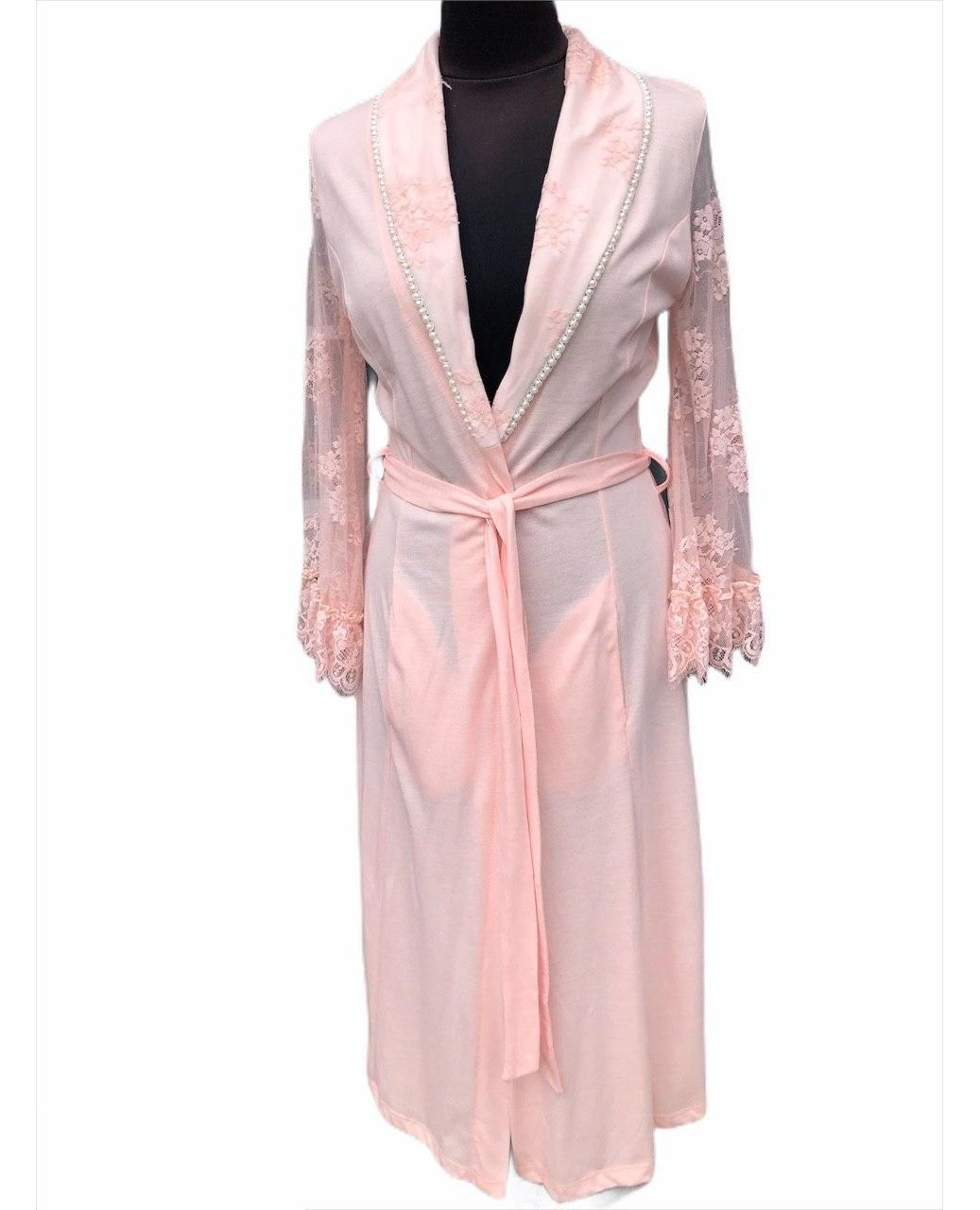 Женский халат на запах нежного розового цвета. Модель отличается элегантным дизайном и изысканной отделкой кружевом и декоративными бусинками. Ткань приятная к телу, хорошо драпируется и обеспечивает комфорт при повседневной носке дома.