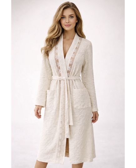 Изысканный женский велюровый халат на запах в нежном кремовом цвете. Модель украшена элегантным кружевом, которое придаёт образу женственность и утончённость. Мягкая и приятная к телу ткань обеспечивает комфорт и уют при носке. Идеальный выбор для дома и отдыха.