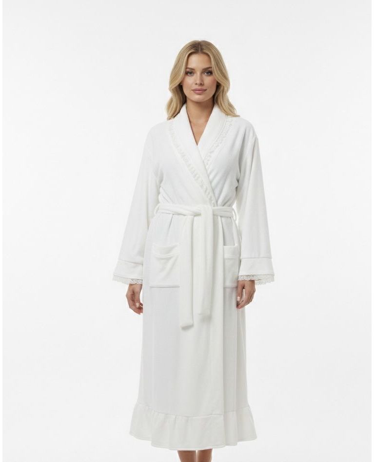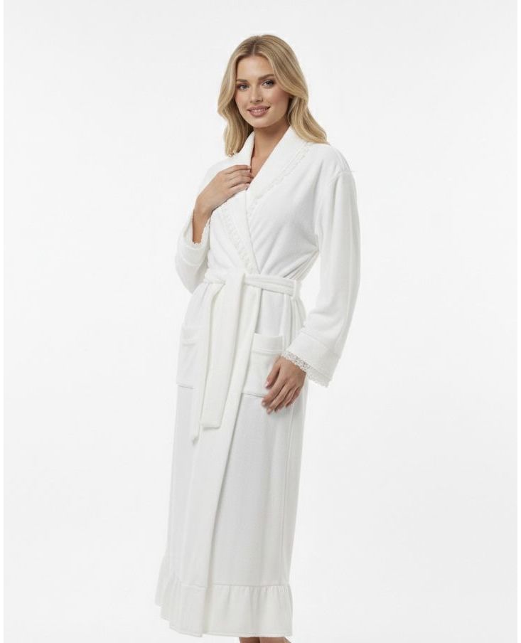 Элегантный женский велюровый халат на запах в нежном молочном цвете. Модель украшена изысканным кружевом, которое придаёт образу женственность и утончённость. Мягкая и приятная к телу ткань обеспечивает комфорт и уют при носке. Идеальный выбор для дома и отдыха.