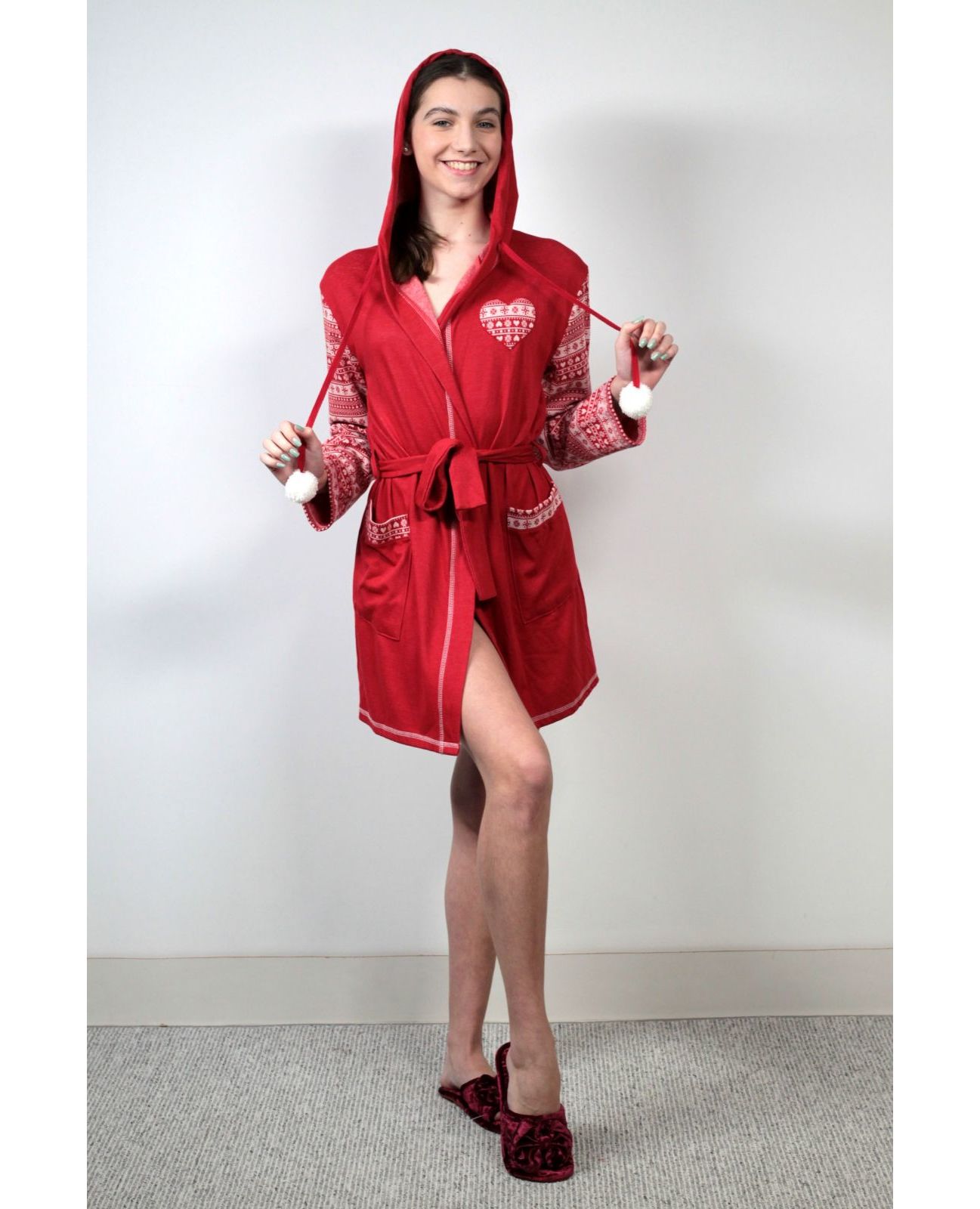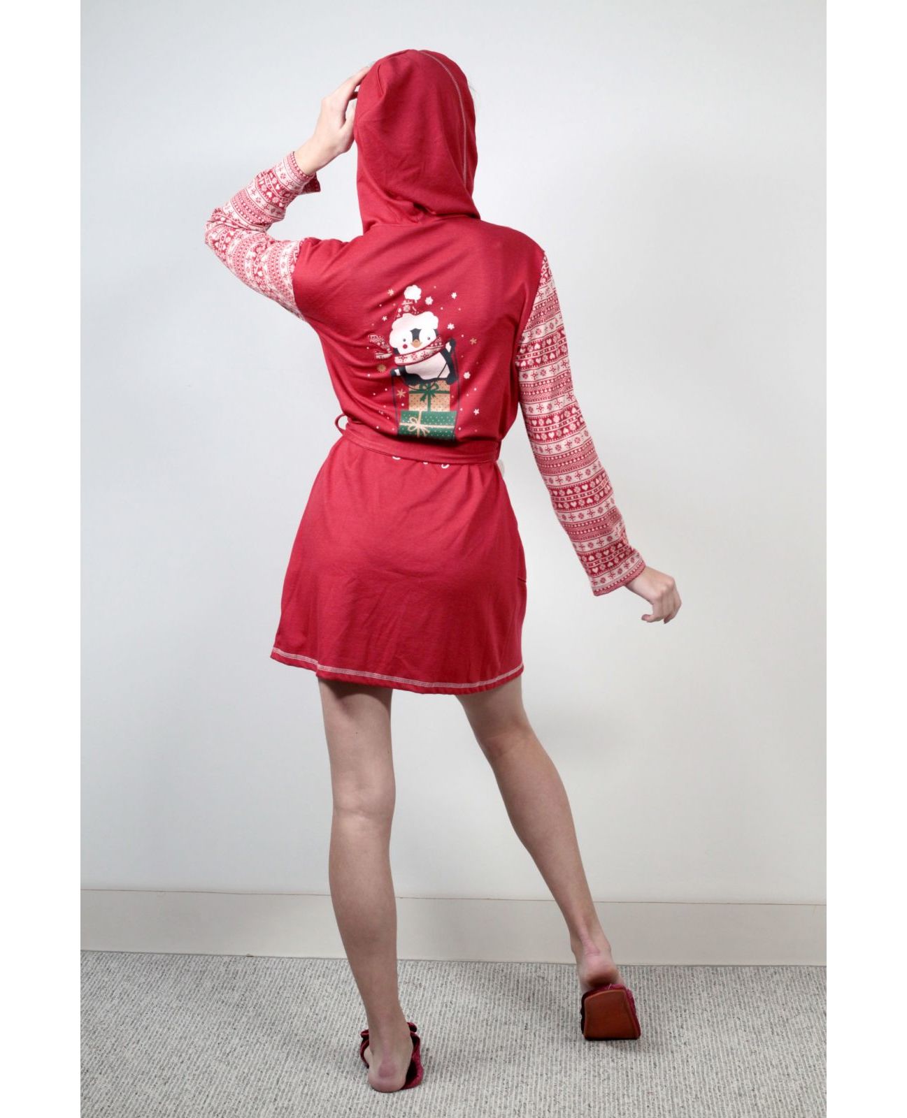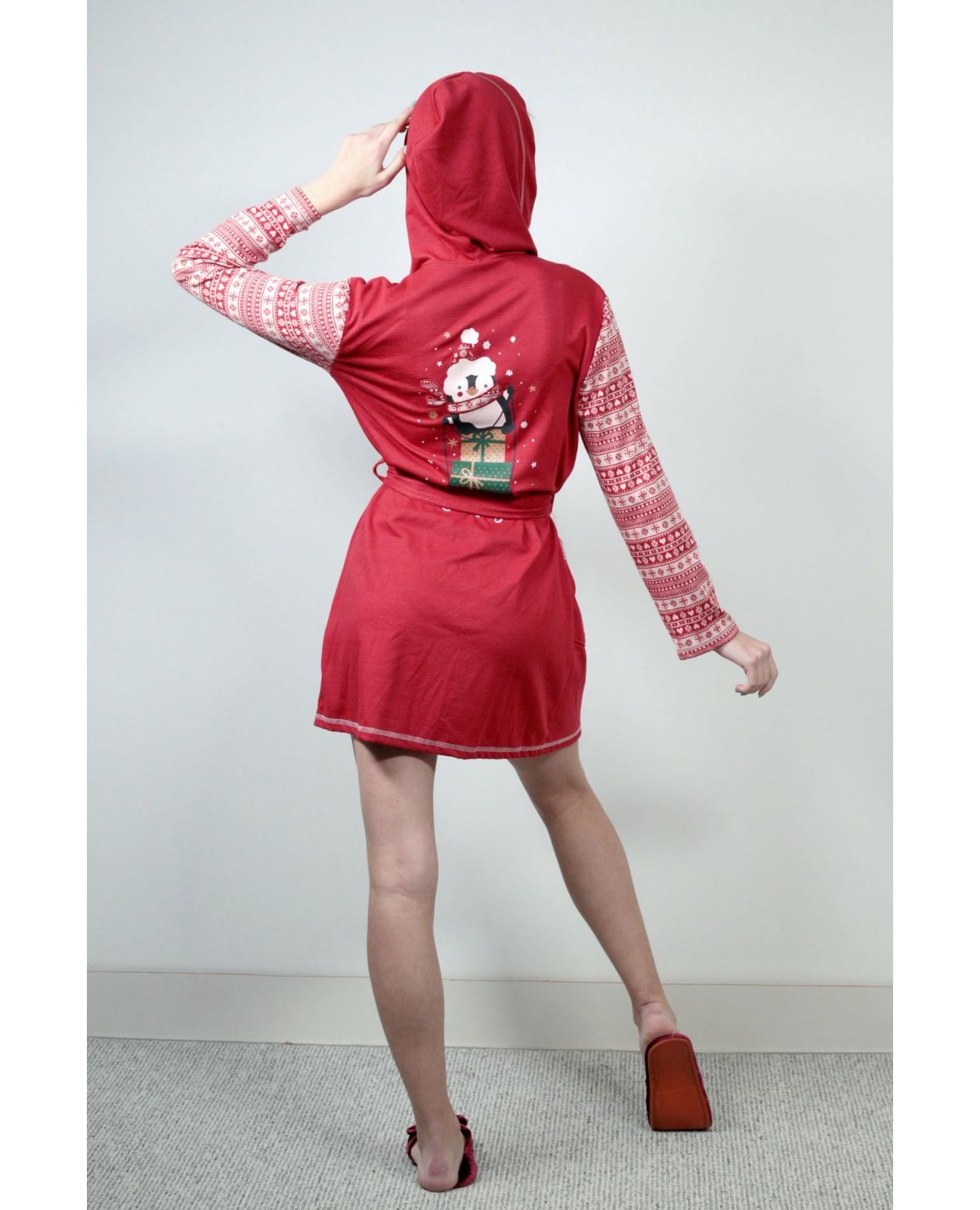 Женский халат на запах с капюшоном и новогодним узором — уютный и праздничный вариант для зимнего домашнего отдыха. Модель выполнена из мягкой и приятной к телу ткани с добавлением вискозы и хлопка, хорошо пропускающей воздух и обеспечивающей комфорт. Фасон на запах с капюшоном обеспечивает удобную посадку, а яркий красный цвет и новогодний орнамент создают праздничное настроение.