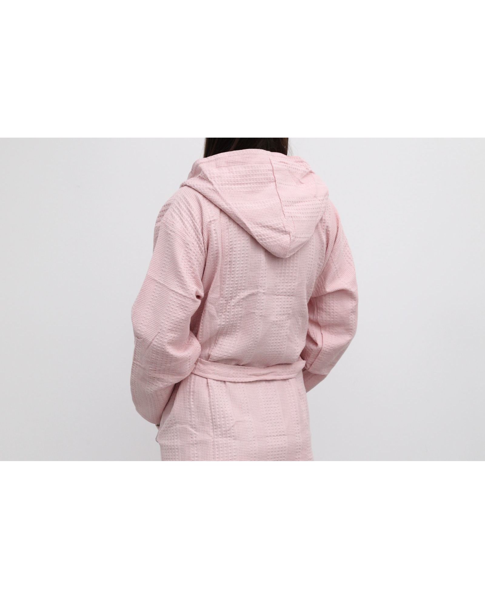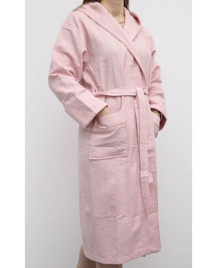 Женский вафельный халат на запах с капюшоном — лёгкий и комфортный вариант для дома, сауны или СПА. Изготовлен из 100% хлопка, халат хорошо впитывает влагу, быстро сохнет и приятен к телу. Фасон на запах обеспечивает удобную посадку, а капюшон добавляет практичности и уюта. Нежный пудровый цвет придаёт изделию изысканный и стильный внешний вид.