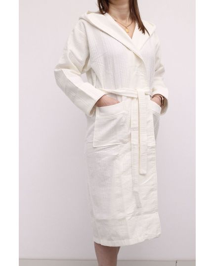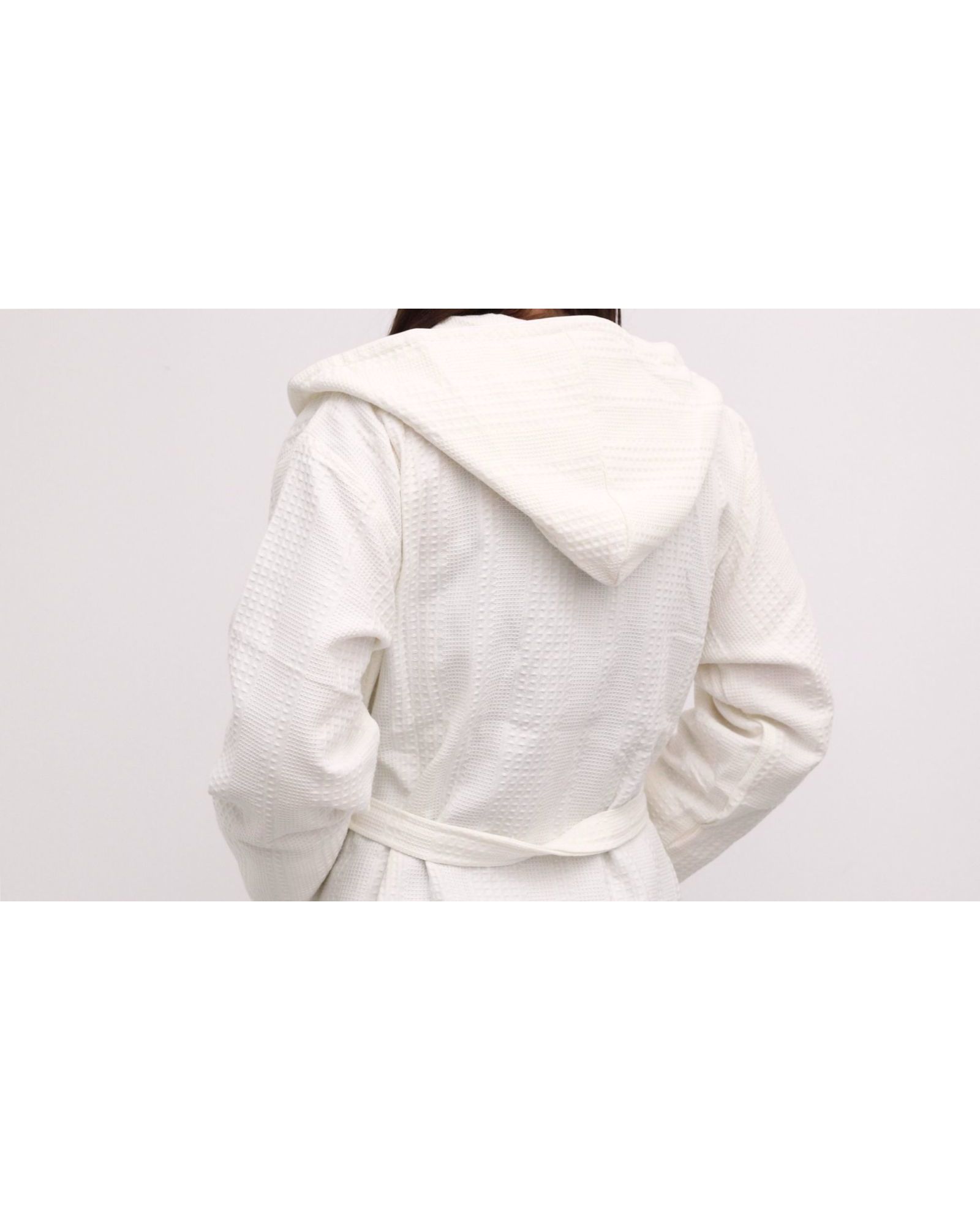 Женский вафельный халат на запах с капюшоном — лёгкий и удобный вариант для дома, сауны или СПА. Изготовлен из 100% хлопка, халат хорошо впитывает влагу, быстро сохнет и приятен к телу. Фасон на запах обеспечивает комфортную посадку, а капюшон добавляет практичности и уюта. Нежный молочный цвет подчёркивает аккуратный и элегантный внешний вид изделия.