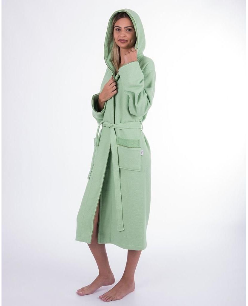 Женский вафельный халат с махровой внутренней стороной на запах с капюшоном — удачное сочетание лёгкости и комфорта. Вафельная внешняя текстура обеспечивает хорошую вентиляцию, а махровая внутренняя сторона отлично впитывает влагу и сохраняет тепло после душа или ванны. Капюшон добавляет удобства, а свежий мятный цвет создаёт ощущение чистоты и уюта.