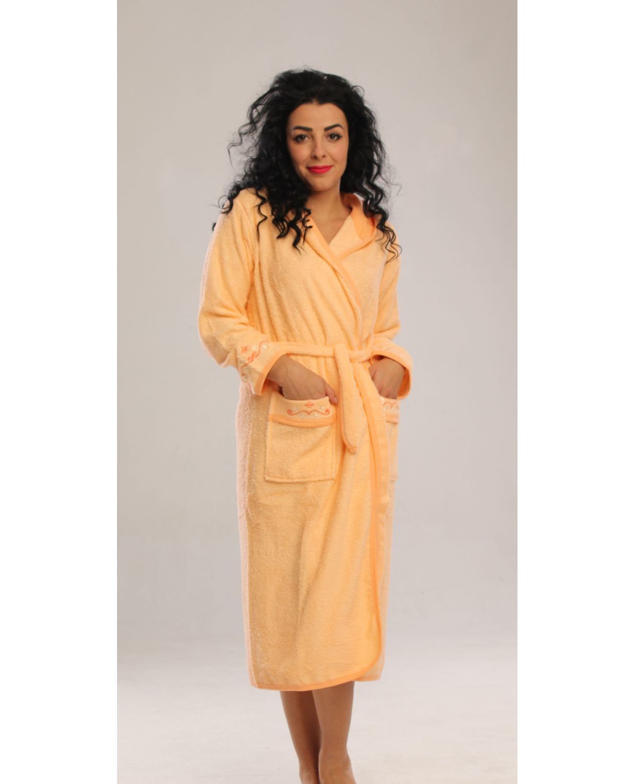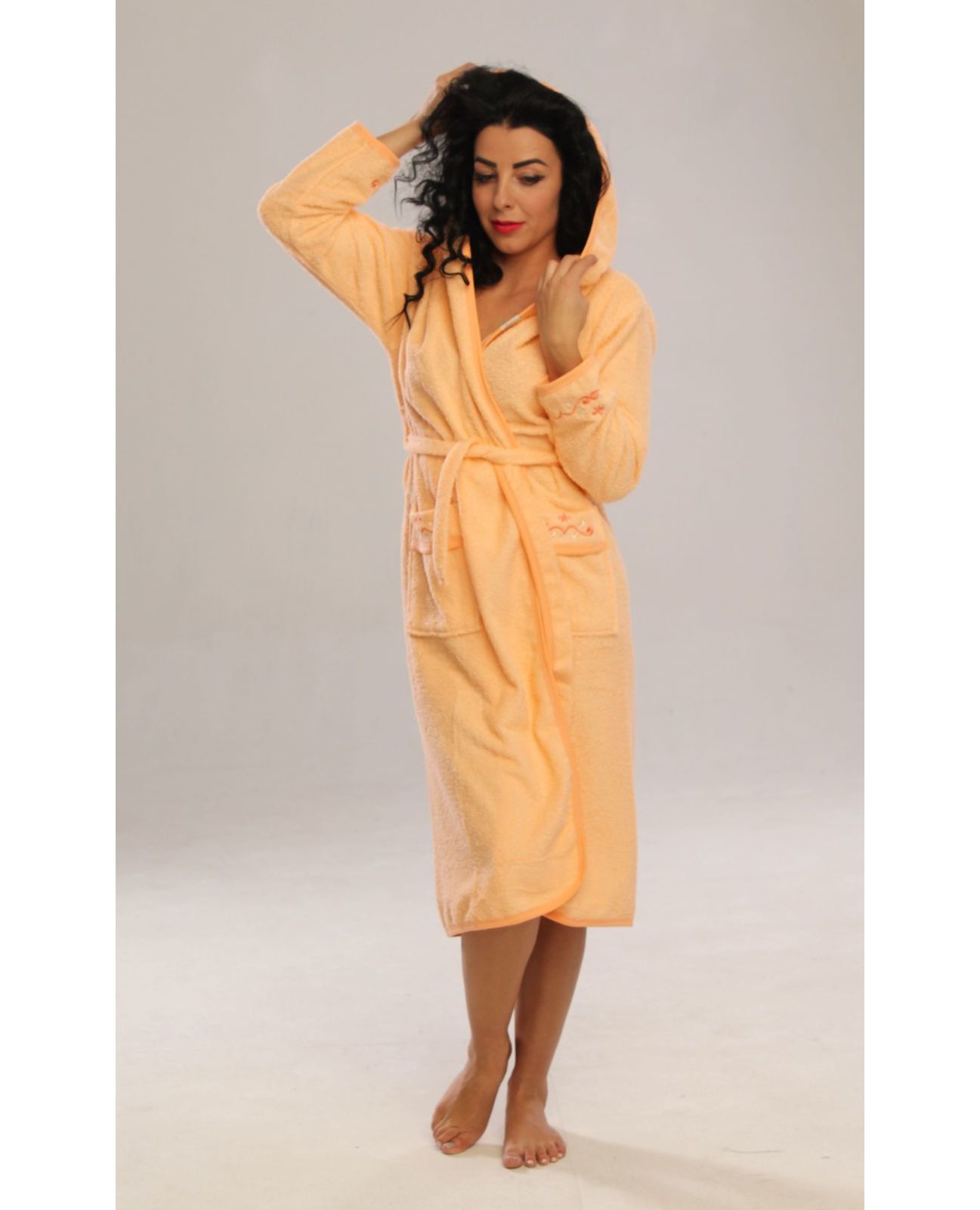 Женский махровый халат на запах с капюшоном абрикосового цвета — уютный и практичный вариант для дома. Мягкая махровая ткань приятна к телу, хорошо впитывает влагу и дарит комфорт после душа или ванны. Модель на запах удобно регулируется по фигуре, а капюшон добавляет дополнительное тепло и удобство.