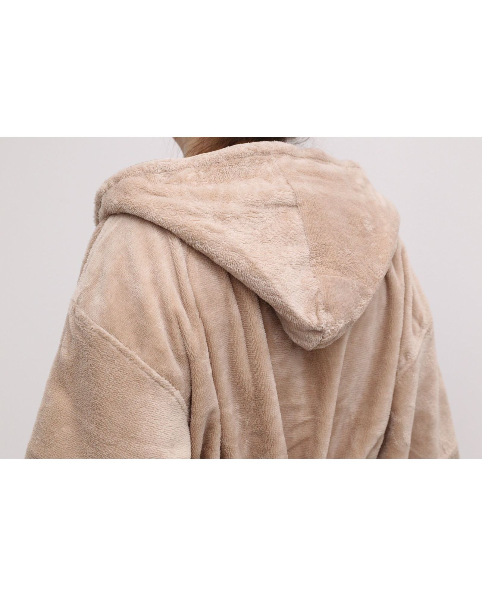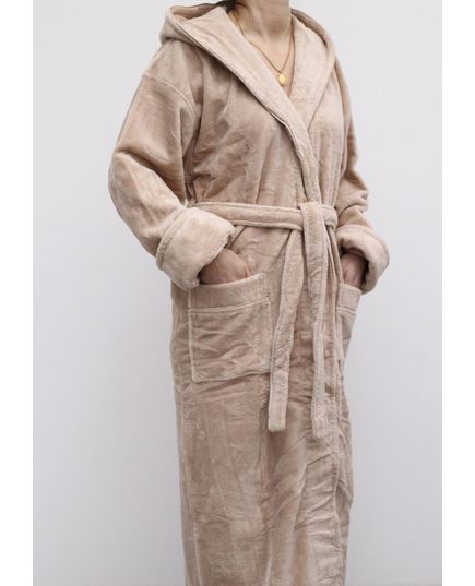 Женский махровый халат с капюшоном на запах — удобный и практичный вариант для дома. Изготовлен из смеси бамбука и хлопка (70% бамбук, 30% хлопок), халат мягкий, приятный к телу, хорошо впитывает влагу и быстро сохнет. Фасон на запах обеспечивает удобную посадку, а капюшон добавляет тепла и уюта. Нежный бежевый цвет придаёт изделию универсальный и стильный внешний вид.