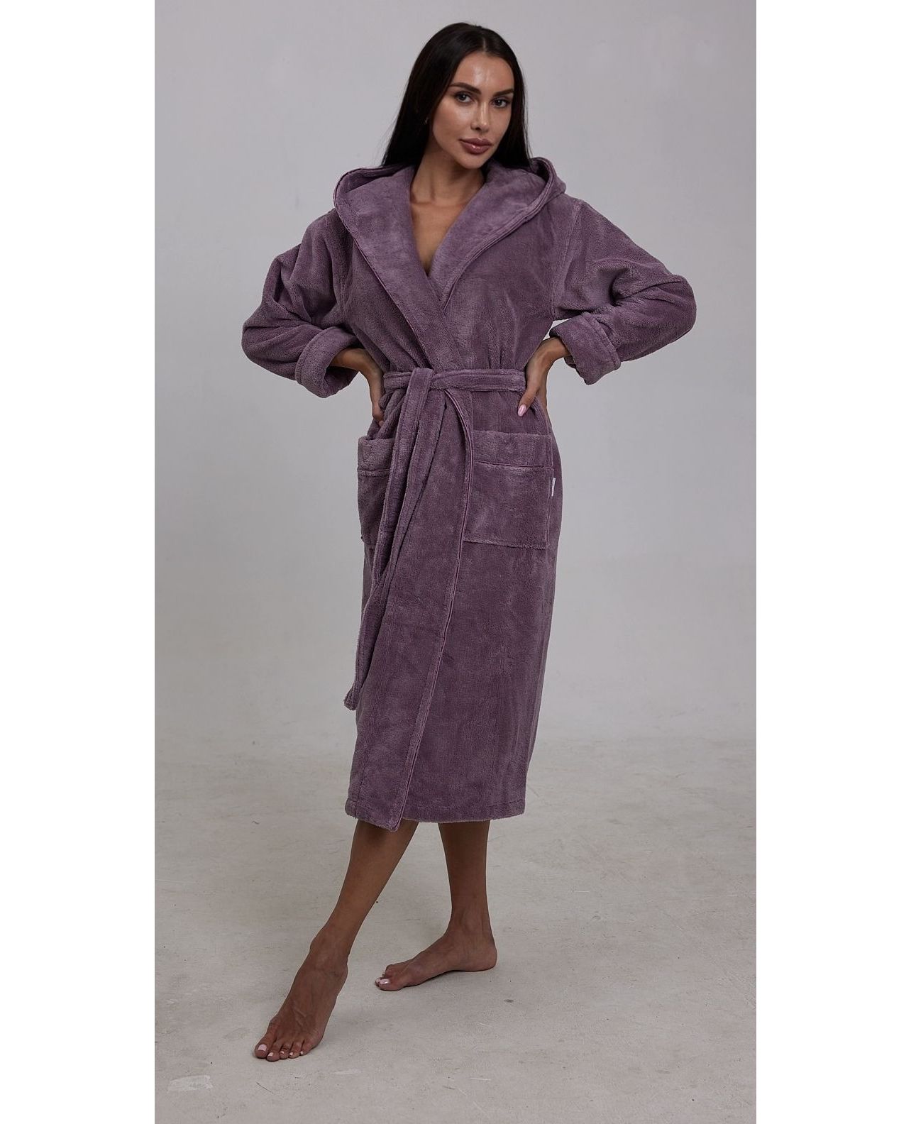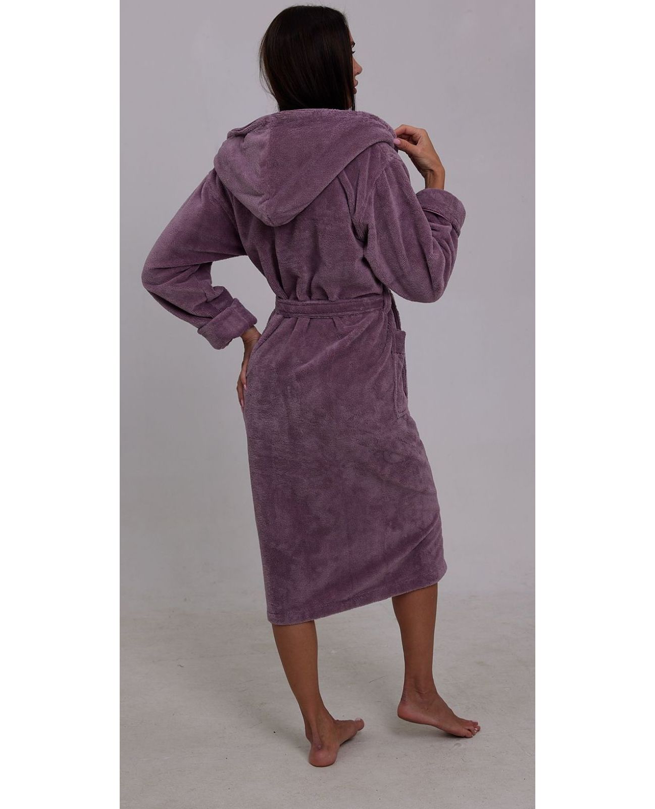 Женский махровый халат на запах с капюшоном — комфортный и стильный вариант для дома. Мягкий и приятный к телу, отлично впитывает влагу и сохраняет тепло после душа или ванны. Капюшон добавляет удобства, а нежный сиреневый цвет создаёт спокойное и гармоничное настроение.