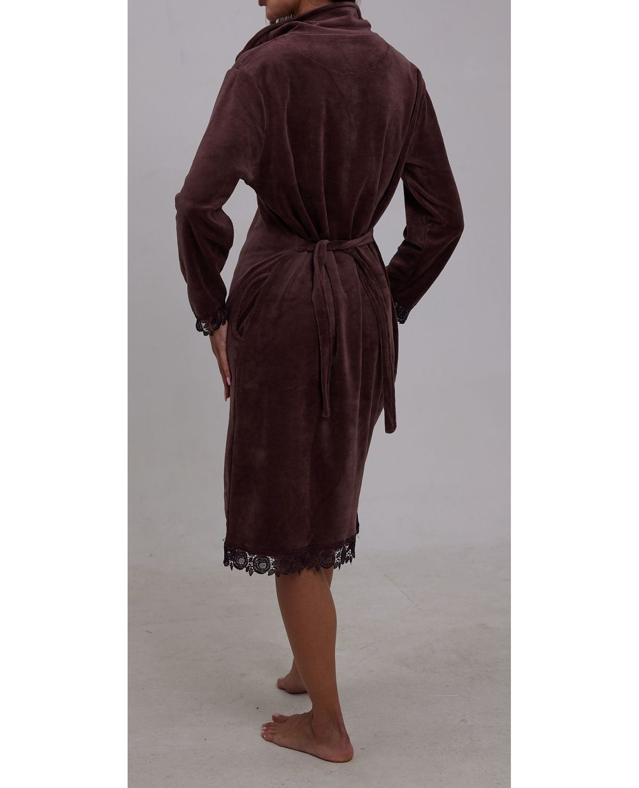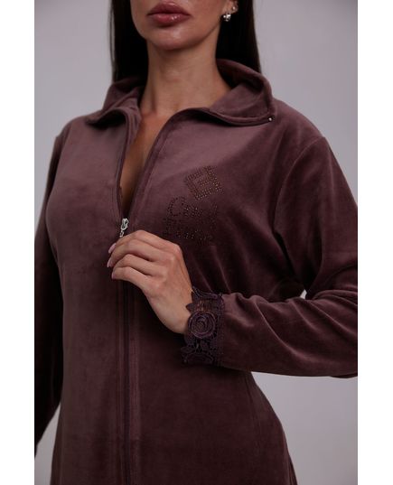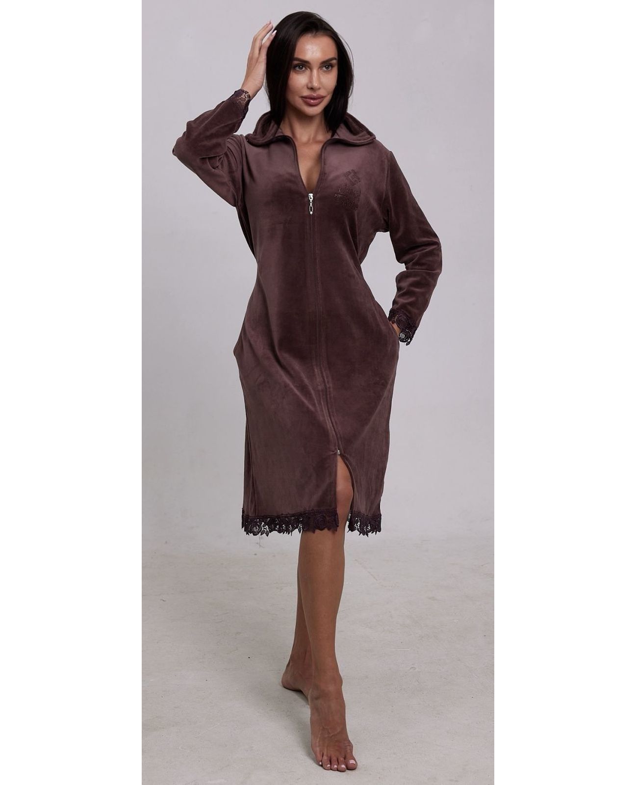 Женский велюровый халат на молнии, украшенный кружевом и стразами, коричневого цвета — изысканный и стильный вариант для дома. Мягкий хлопковый велюр приятен к телу, хорошо пропускает воздух и обеспечивает комфорт при носке. Декоративное кружево и стразы придают модели женственность и утончённый внешний вид, а застёжка-молния делает халат удобным и практичным.
