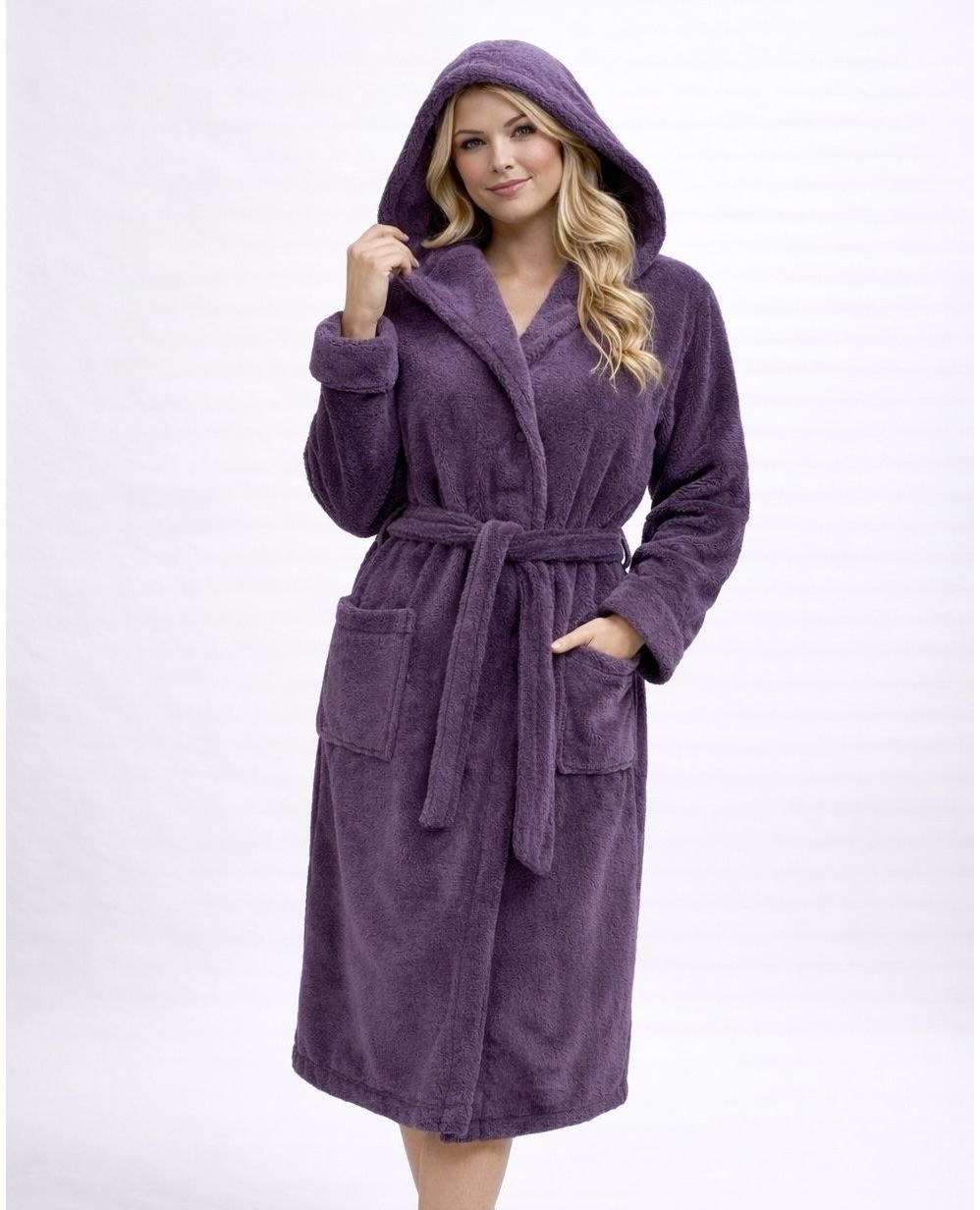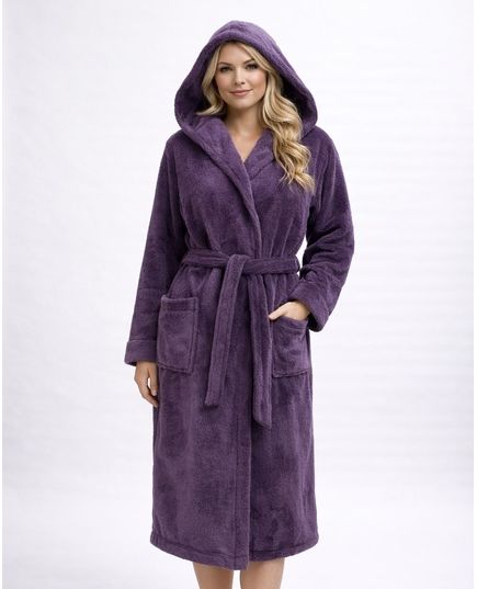 Стильный и уютный халат сливового оттенка из мягкой махровой ткани станет отличным выбором для домашнего отдыха. Модель на запах с поясом обеспечивает удобную посадку, а капюшон добавляет дополнительное тепло и комфорт. Лёгкая и практичная ткань приятна к телу и проста в уходе.