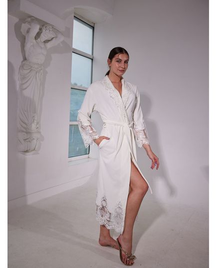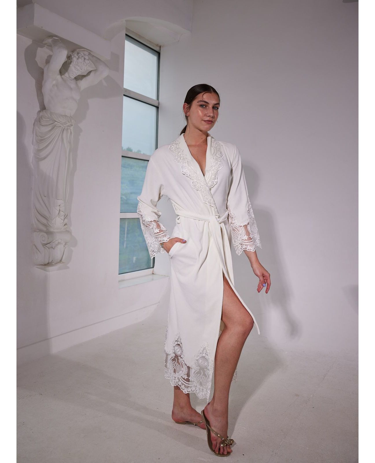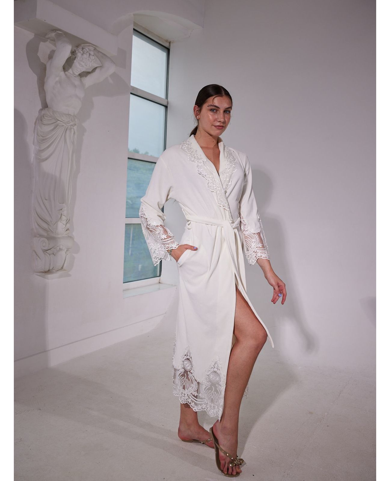 Женский велюровый халат на запах — элегантный и нежный вариант для домашнего гардероба. Мягкий и приятный к телу, обеспечивает комфорт и уют в повседневной носке. Изящная отделка кружевом подчёркивает женственность и утончённость модели, а молочный цвет смотрится светло, стильно и благородно.