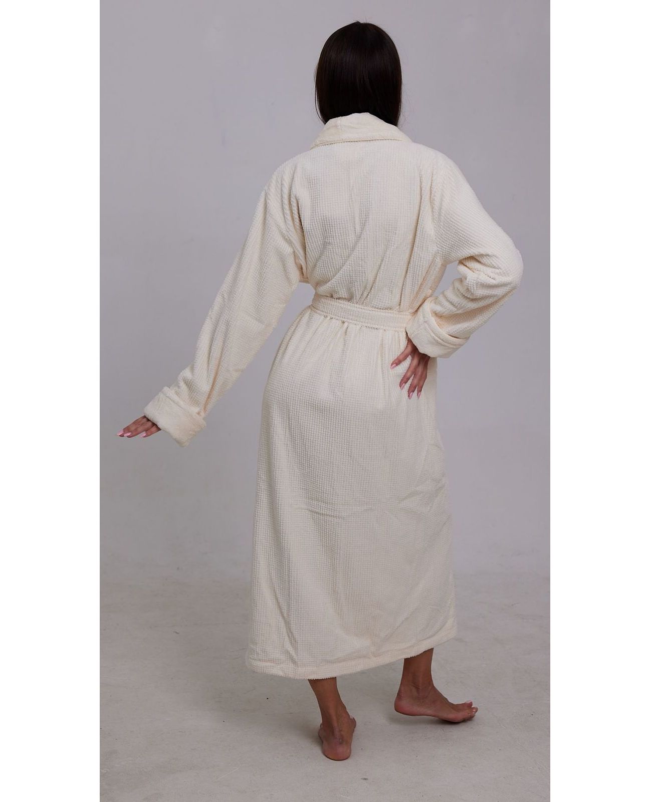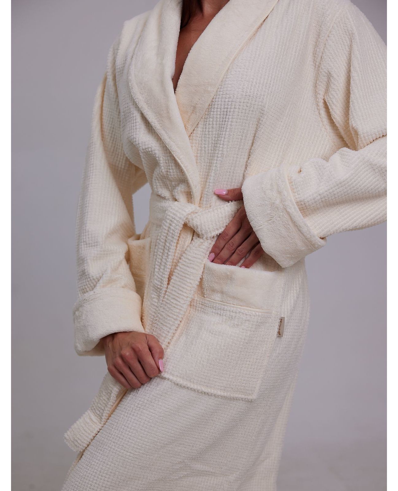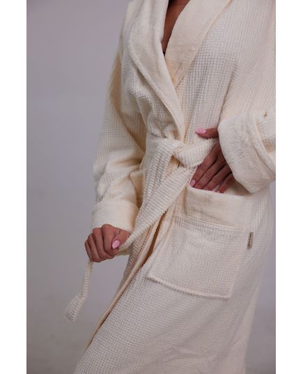 Женский махровый халат на запах с капюшоном молочного цвета — удобный и практичный вариант для дома. Мягкий материал из 50% хлопка и 50% бамбука приятен к телу, хорошо пропускает воздух и обеспечивает нежность и комфорт при носке. Капюшон добавляет уют, а модель на запах удобно застёгивается и идеально подходит для повседневного использования.