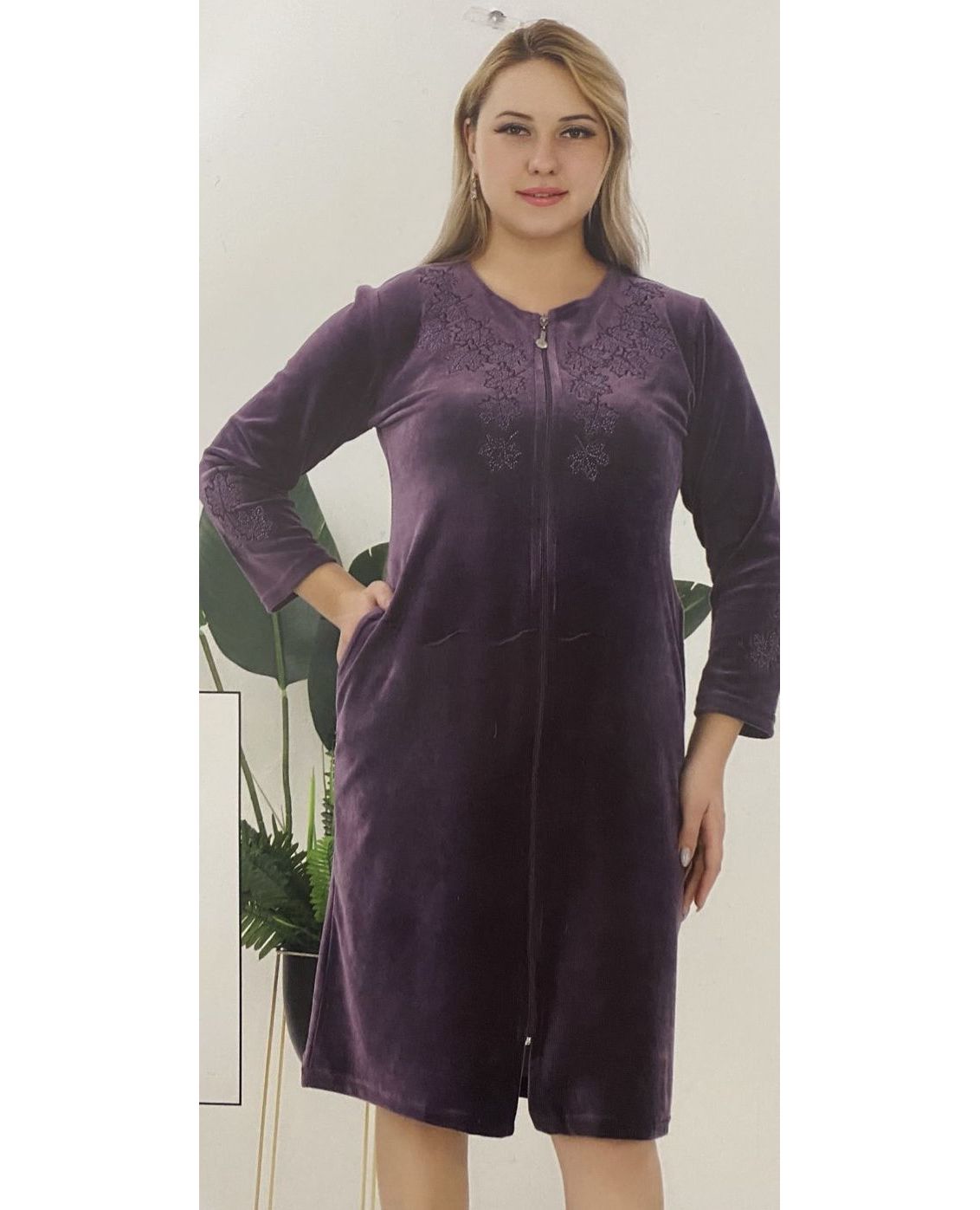 Женский велюровый халат на молнии фиолетового цвета, украшенный вышивкой и стразами. Модель сочетает комфорт и элегантность, приятная к телу и удобная в носке. Идеально подходит для домашнего отдыха.