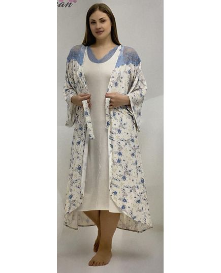 Комплект ночная сорочка + халат. Сеорочка верх как майка. Халат серый в голубой цветочек , кружевные вставки голубого цвета, с поясом.