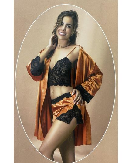 В набор входит майка-топ, шорты, халат. Топ с кружевом спереди, шорты с кружевной вставкой. Халат на запах с поясом, короткий