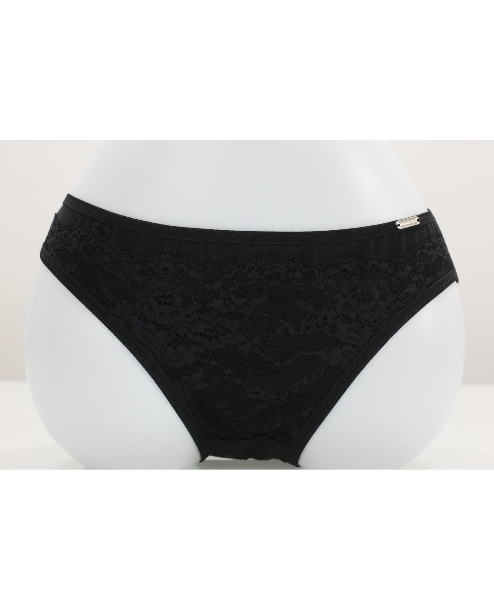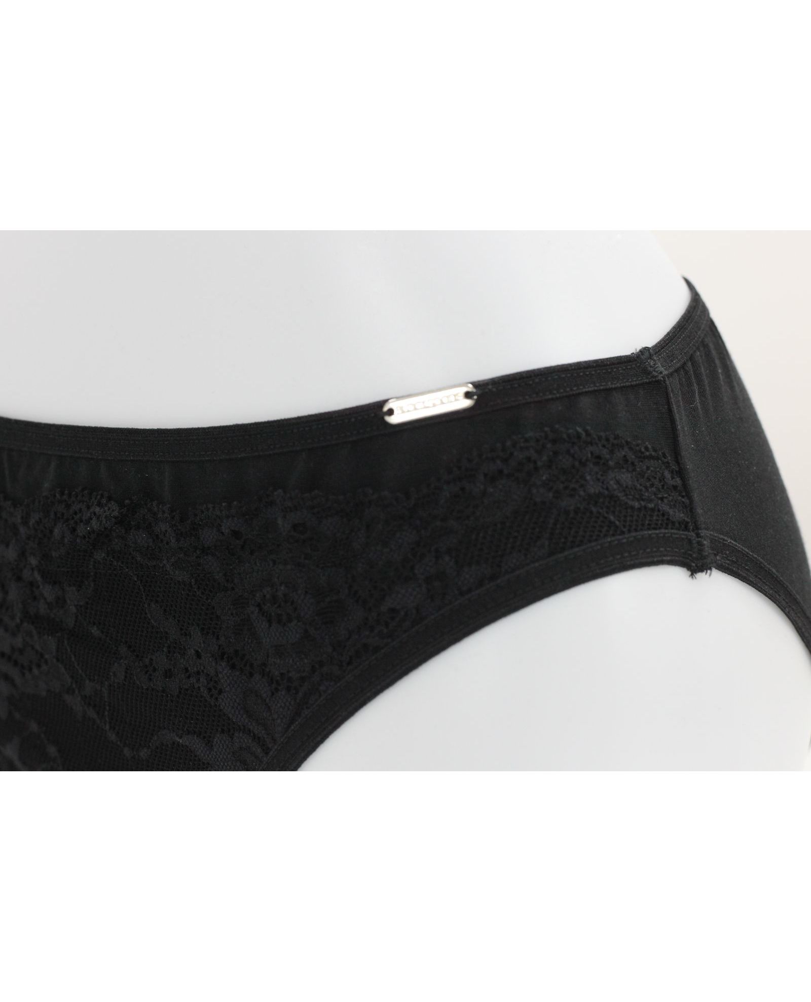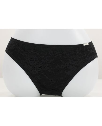 Женские трусы чёрного цвета, украшенные изысканным кружевом. Модель сочетает элегантный дизайн и удобную посадку, обеспечивая комфорт на протяжении всего дня. Мягкий модал делает изделие приятным к телу, а эластан обеспечивает эластичность и долговечность.