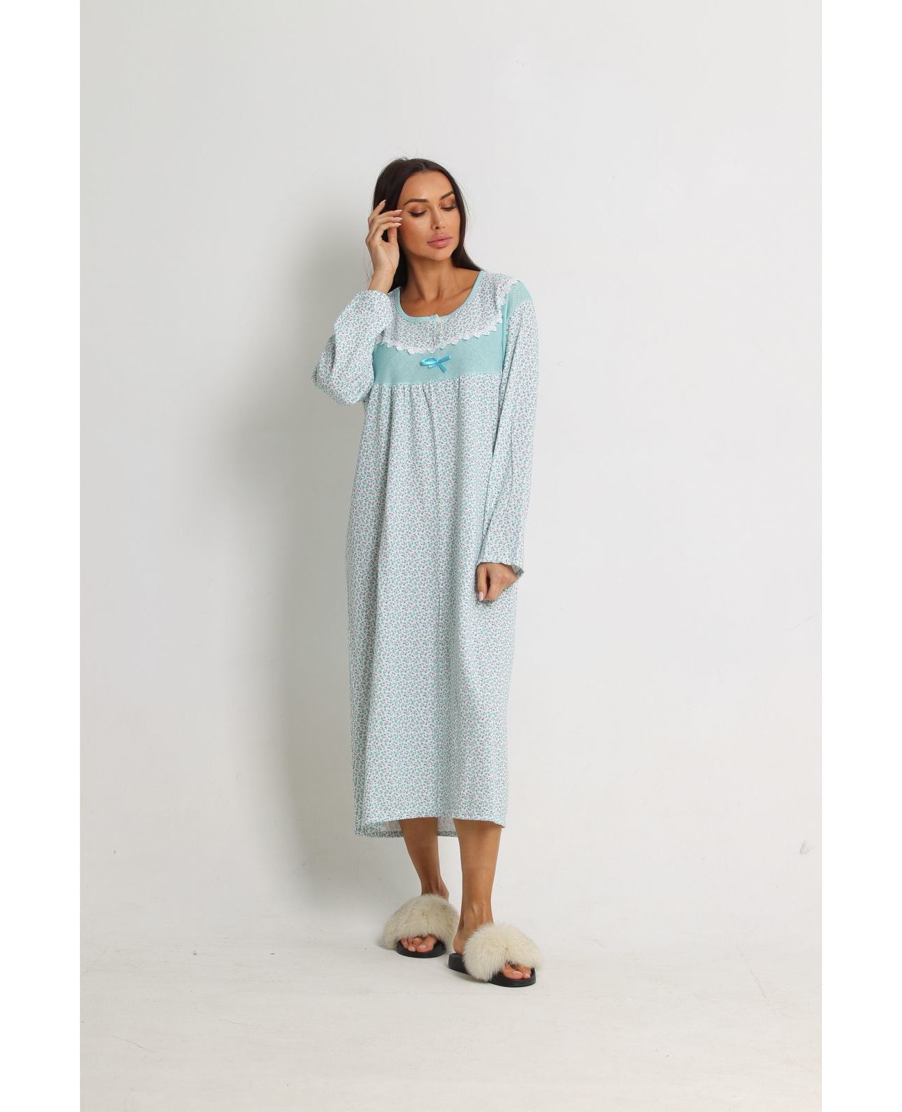 Элегантная длинная ночная сорочка в нежном бирюзовом цвете подарит комфорт и уют во время сна. Модель с длинными рукавами и изящной кружевной отделкой выглядит женственно и стильно. Натуральный хлопок обеспечивает мягкость и приятные ощущения к телу.