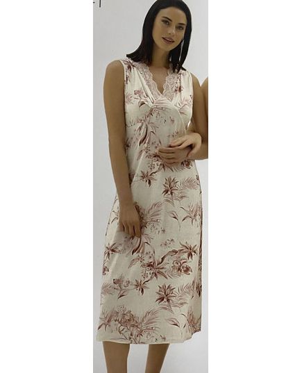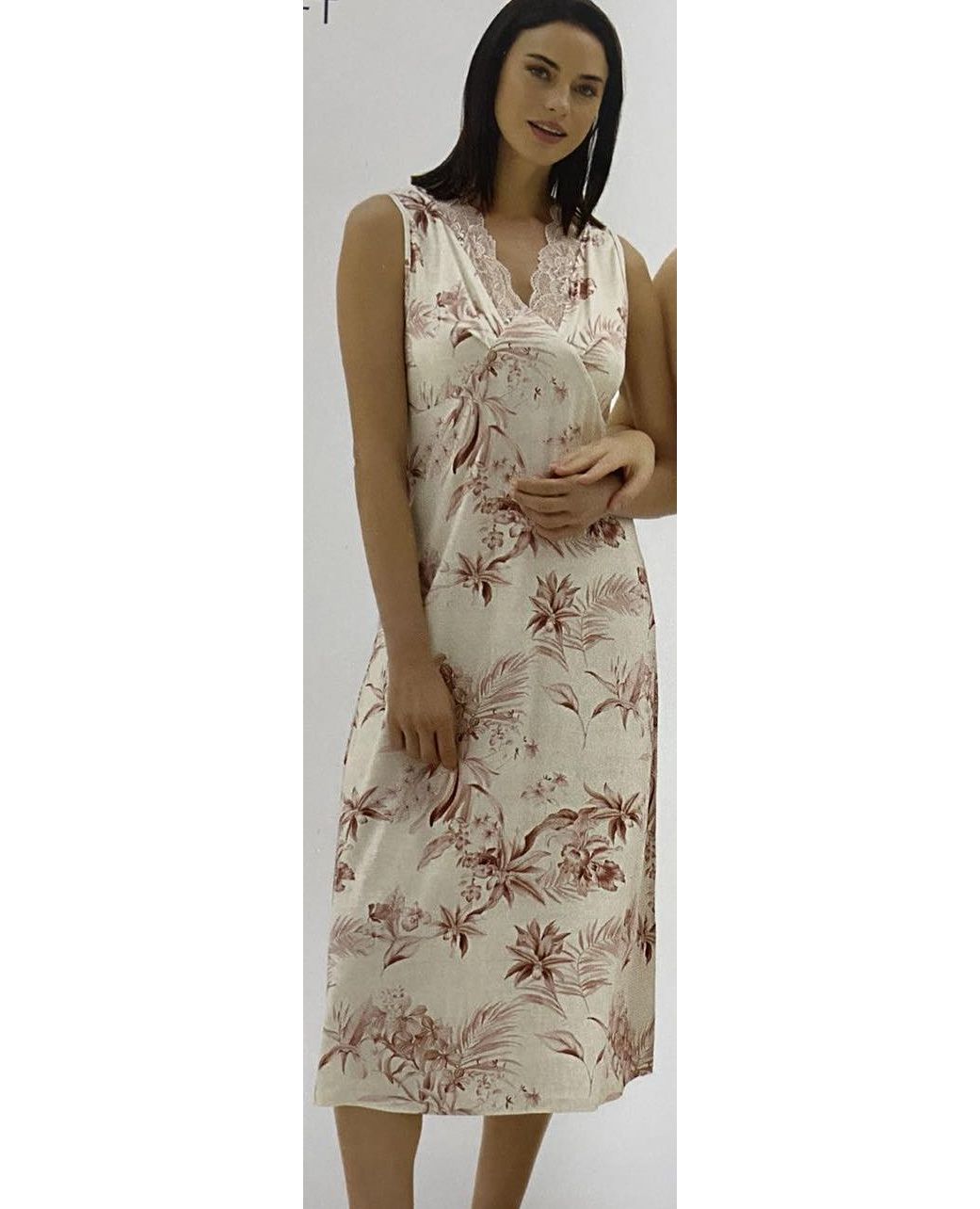 Ночная сорочка нежного бежевого цвета с цветочным узором. V образный вырез отделаный кружевом. Длинная