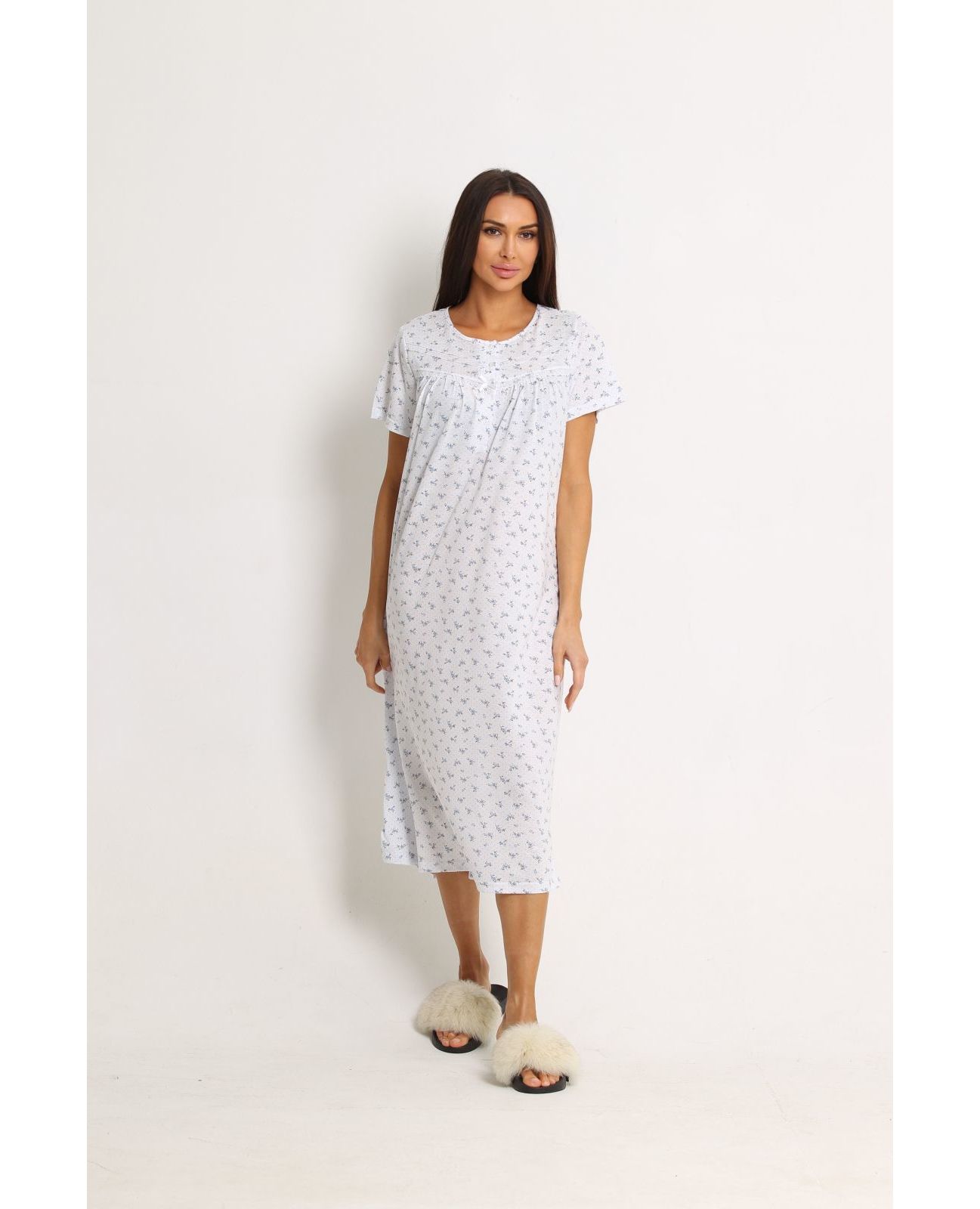 Элегантная длинная ночная сорочка голубого цвета подарит ощущение легкости и уюта во время сна. Модель с коротким рукавом украшена изящным кружевом и цветочным принтом, что придает образу нежность и романтичность. Натуральный хлопок мягкий и приятный к телу, обеспечивая комфорт на протяжении всей ночи.