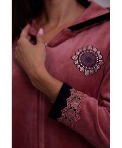Женский велюровый халат с капюшоном на молнии, украшенный кружевом и стразами, пудрового цвета — стильный и уютный вариант для дома. Мягкий хлопковый велюр приятен к телу, хорошо пропускает воздух и обеспечивает комфорт при ежедневной носке. Капюшон добавляет практичности, а кружево и...