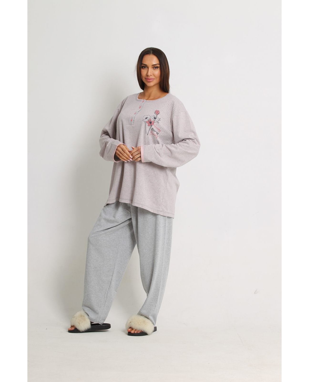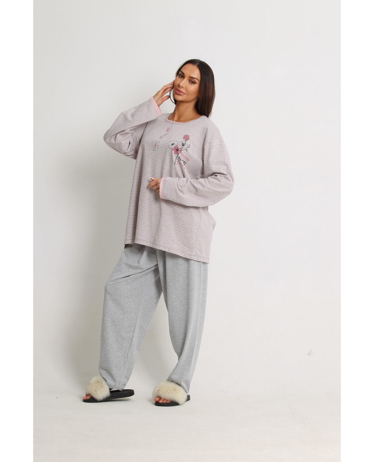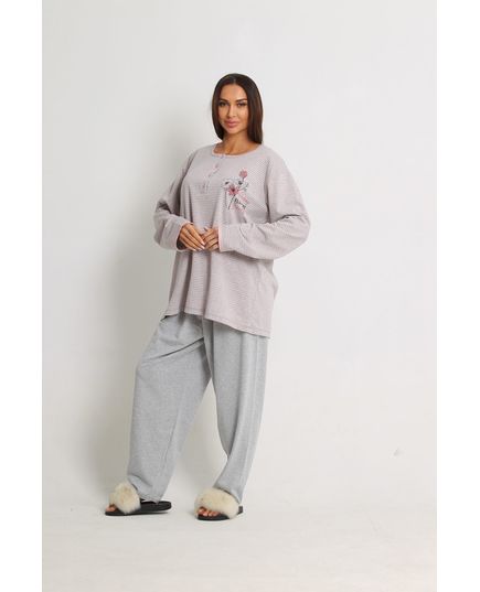 Тёплая пижама с длинным рукавом, серая с розовыми полосами