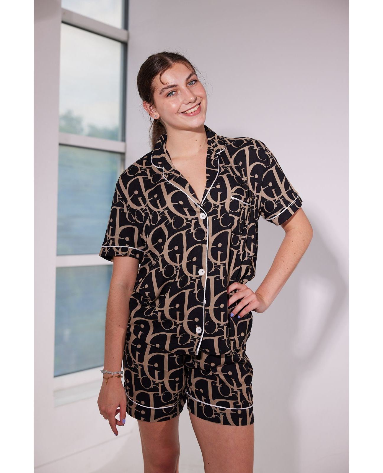 Удобная и элегантная пижама из 100% хлопка идеально подойдёт для сна и домашнего уюта. В комплект входит рубашка на пуговицах с карманом и шорты. Цвет — классический чёрный с изысканными надписями Dior кофейного оттенка.