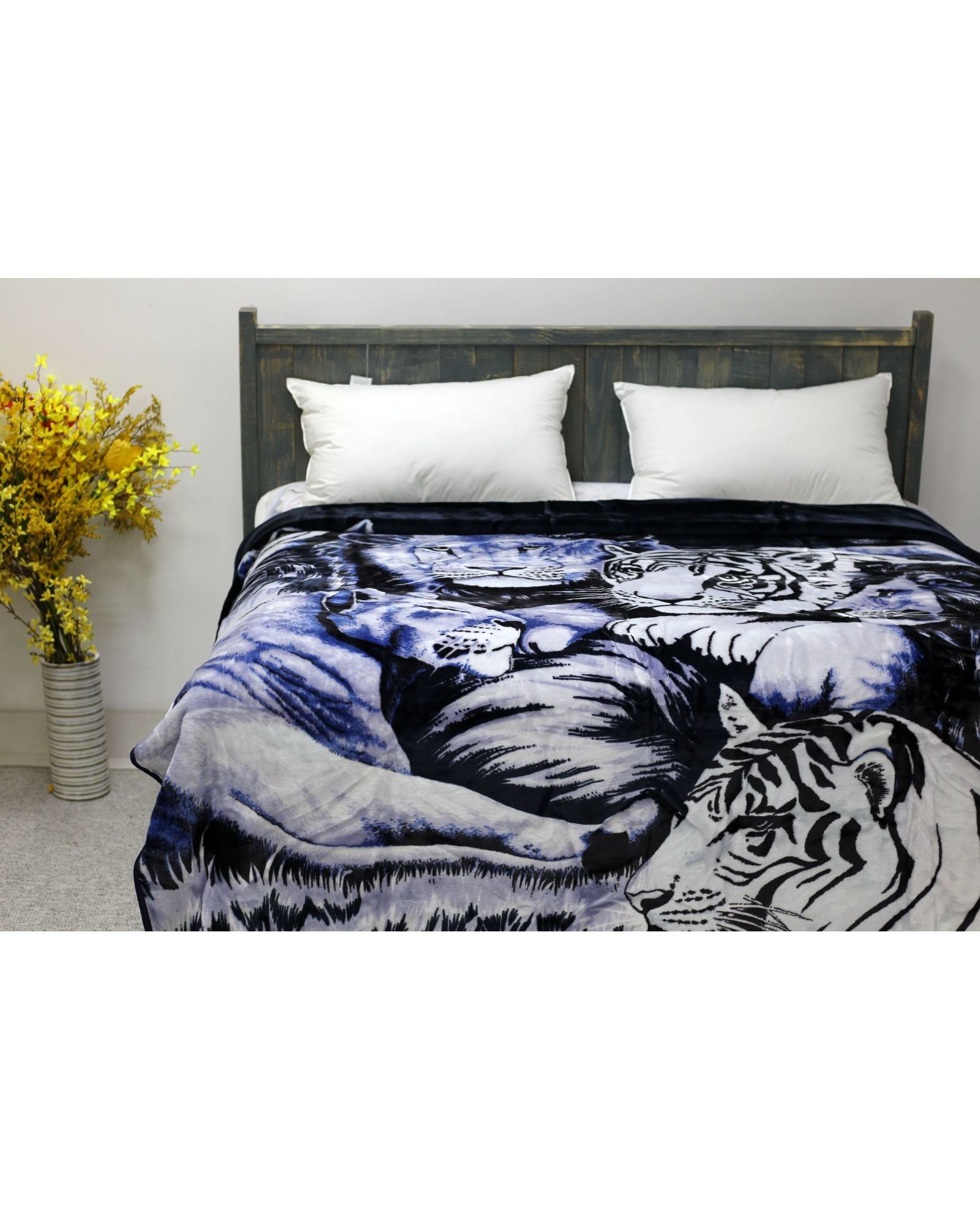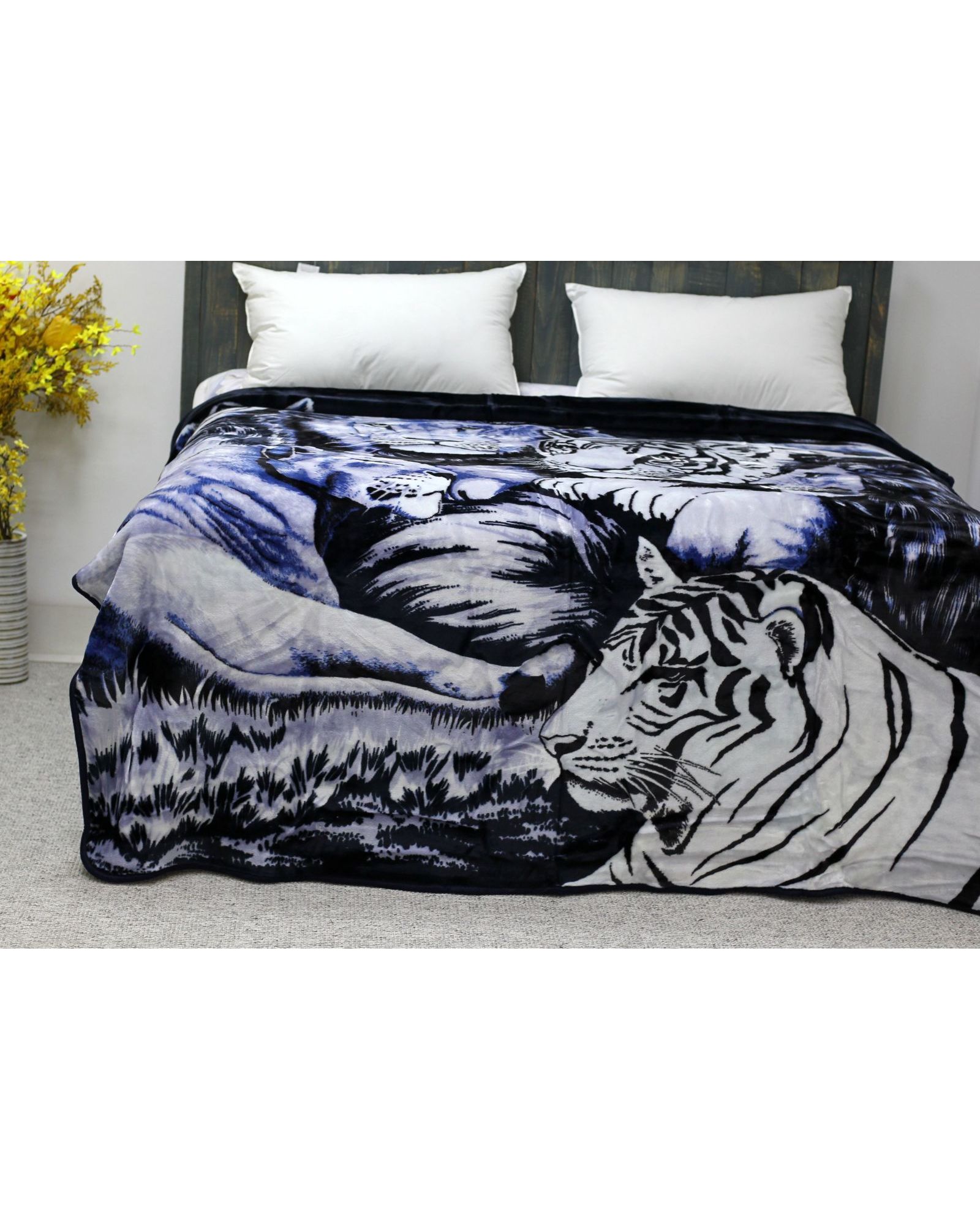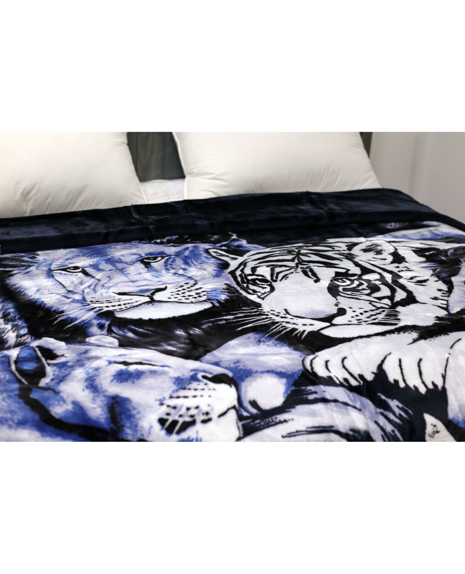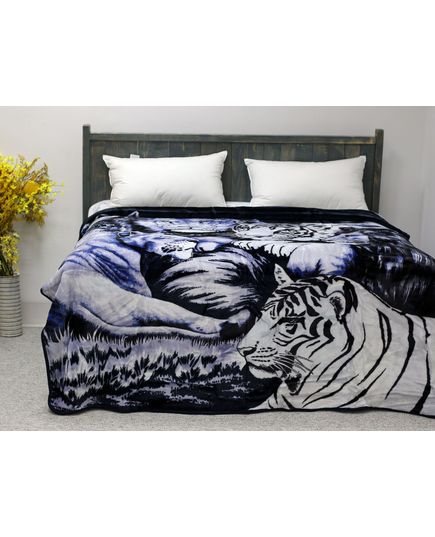 Стильный и тёплый плед станет выразительным элементом вашего интерьера. Глубокий синий цвет в сочетании с чёрным и рисунком тигров создаёт яркий и динамичный дизайн. Мягкая текстура обеспечивает уют и комфорт во время отдыха.
