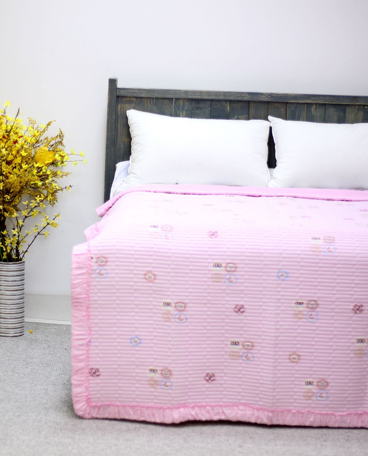 Нежное розовое покрывало с декоративной стёжкой и рюшами придаёт интерьеру лёгкость и утончённость. Оно не только украшает спальню, но и дарит ежедневный комфорт благодаря мягкой и приятной ткани.