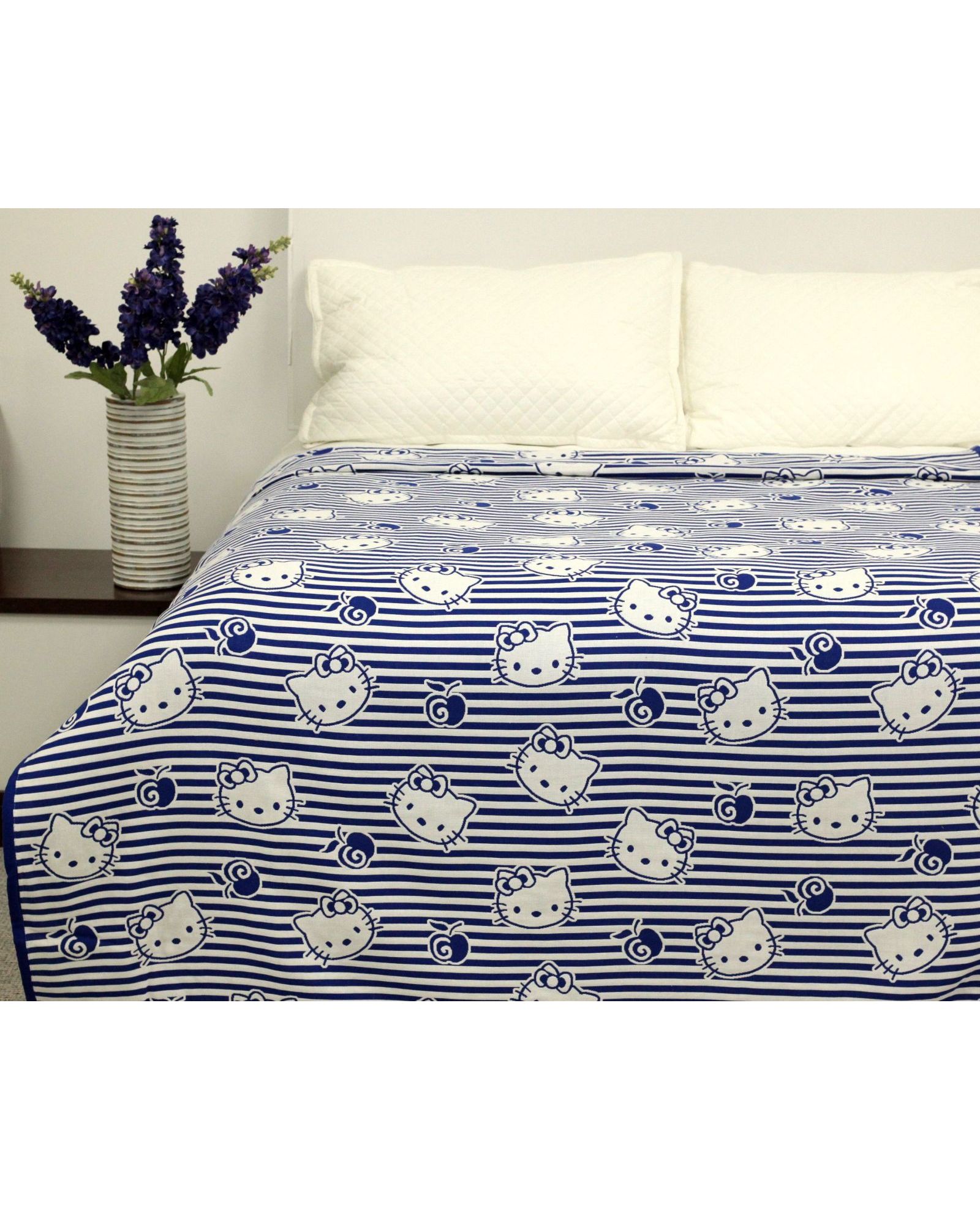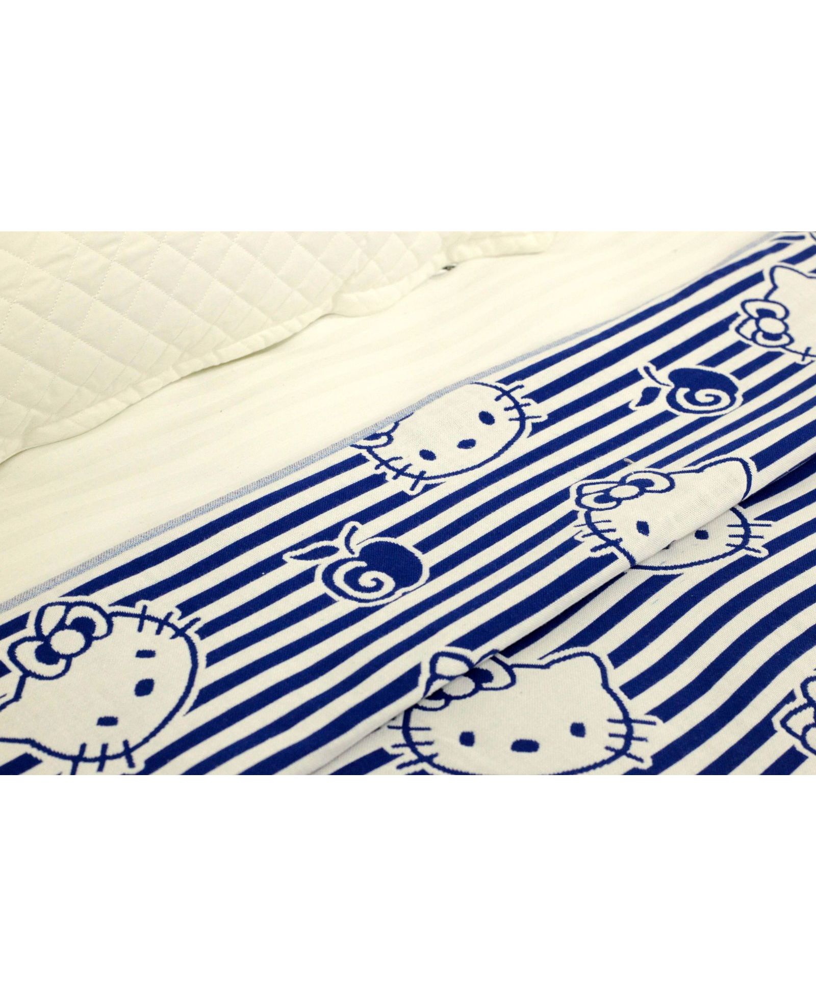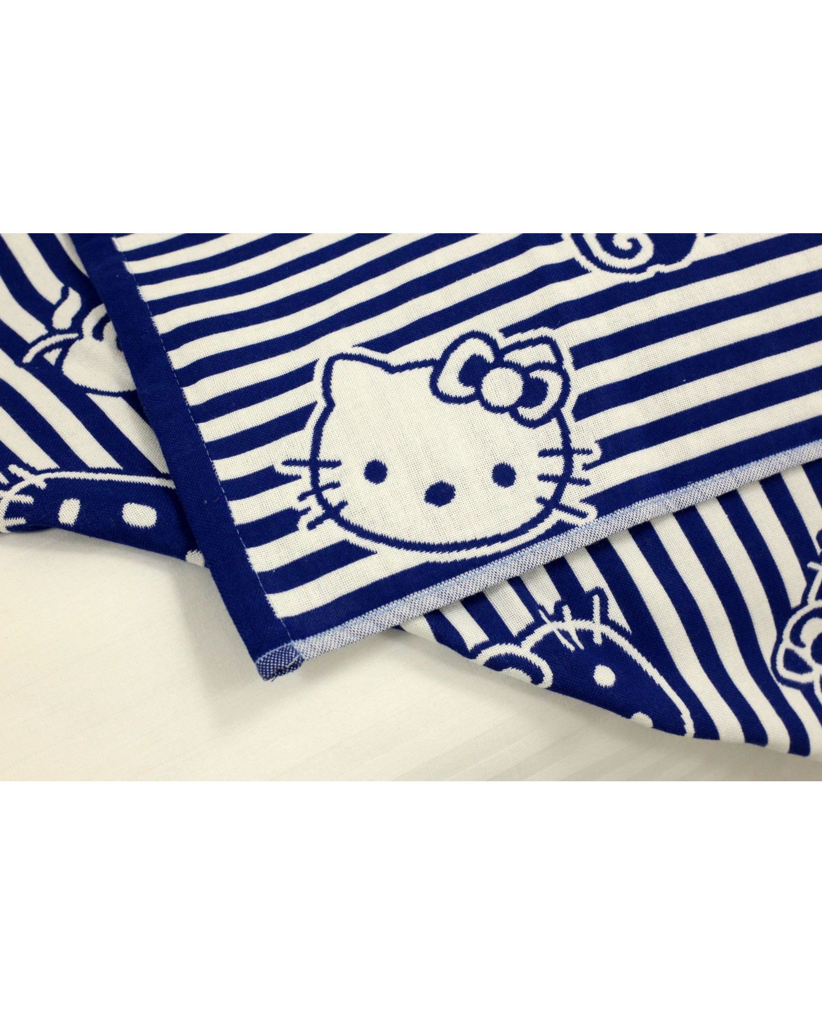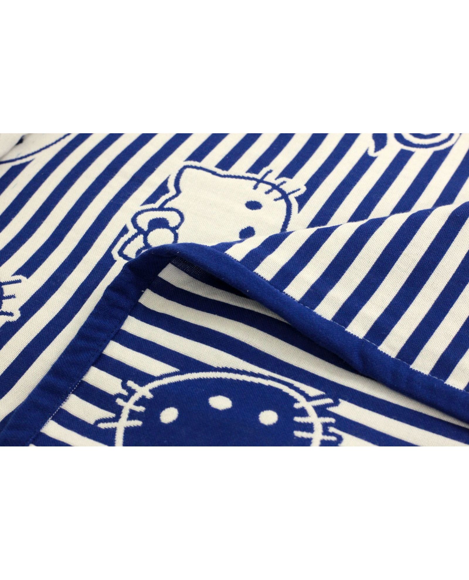 Покрывало 150×200 см белого цвета с синими полосками и изображением Hello Kitty