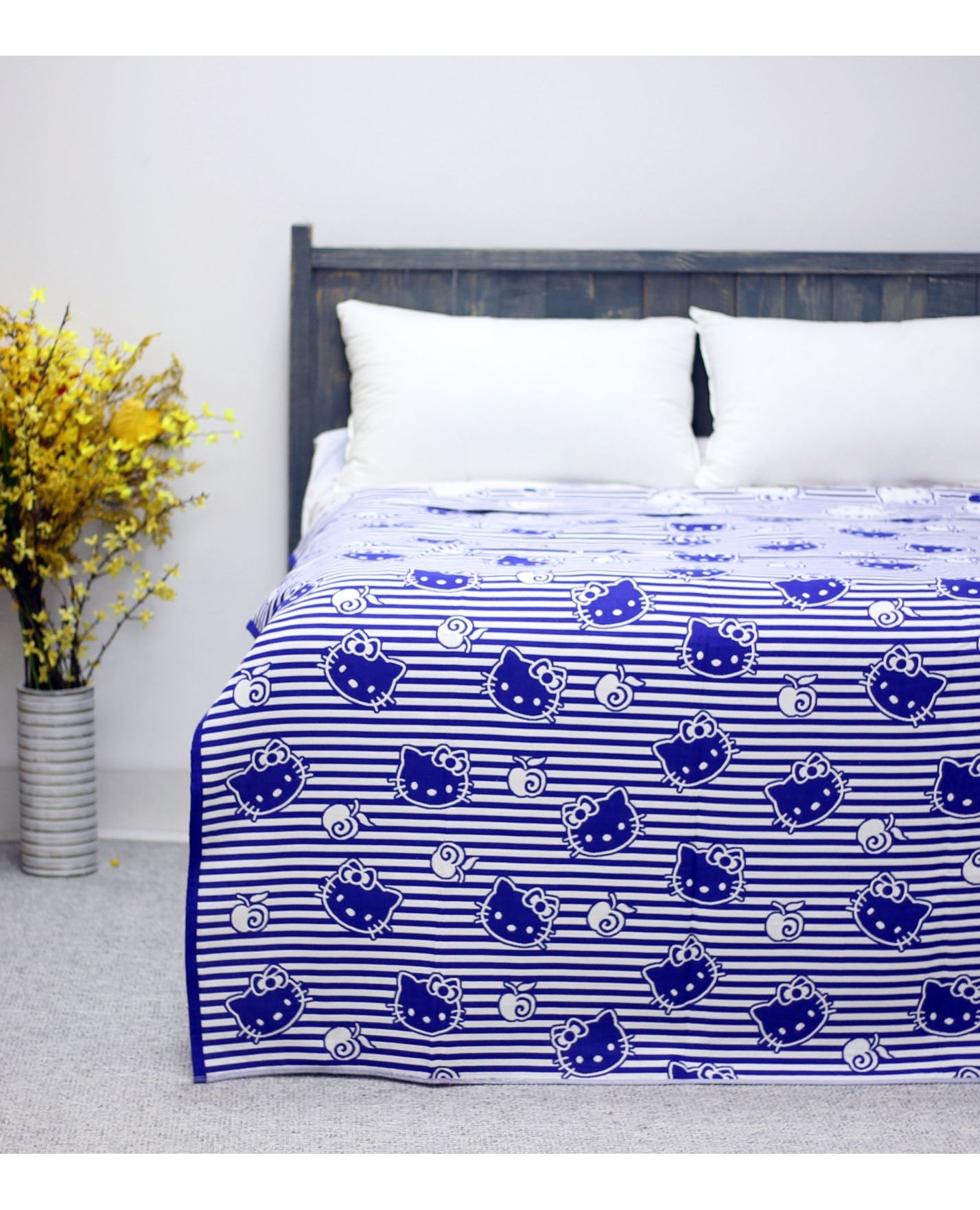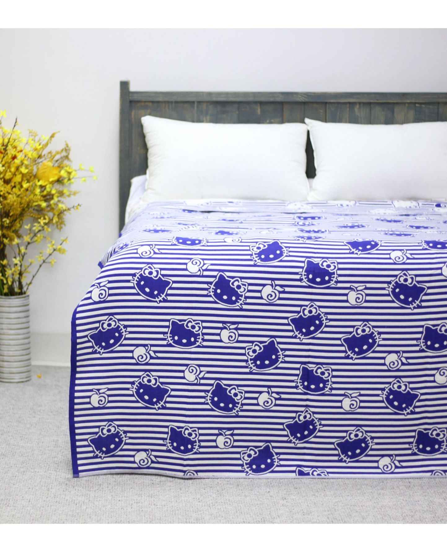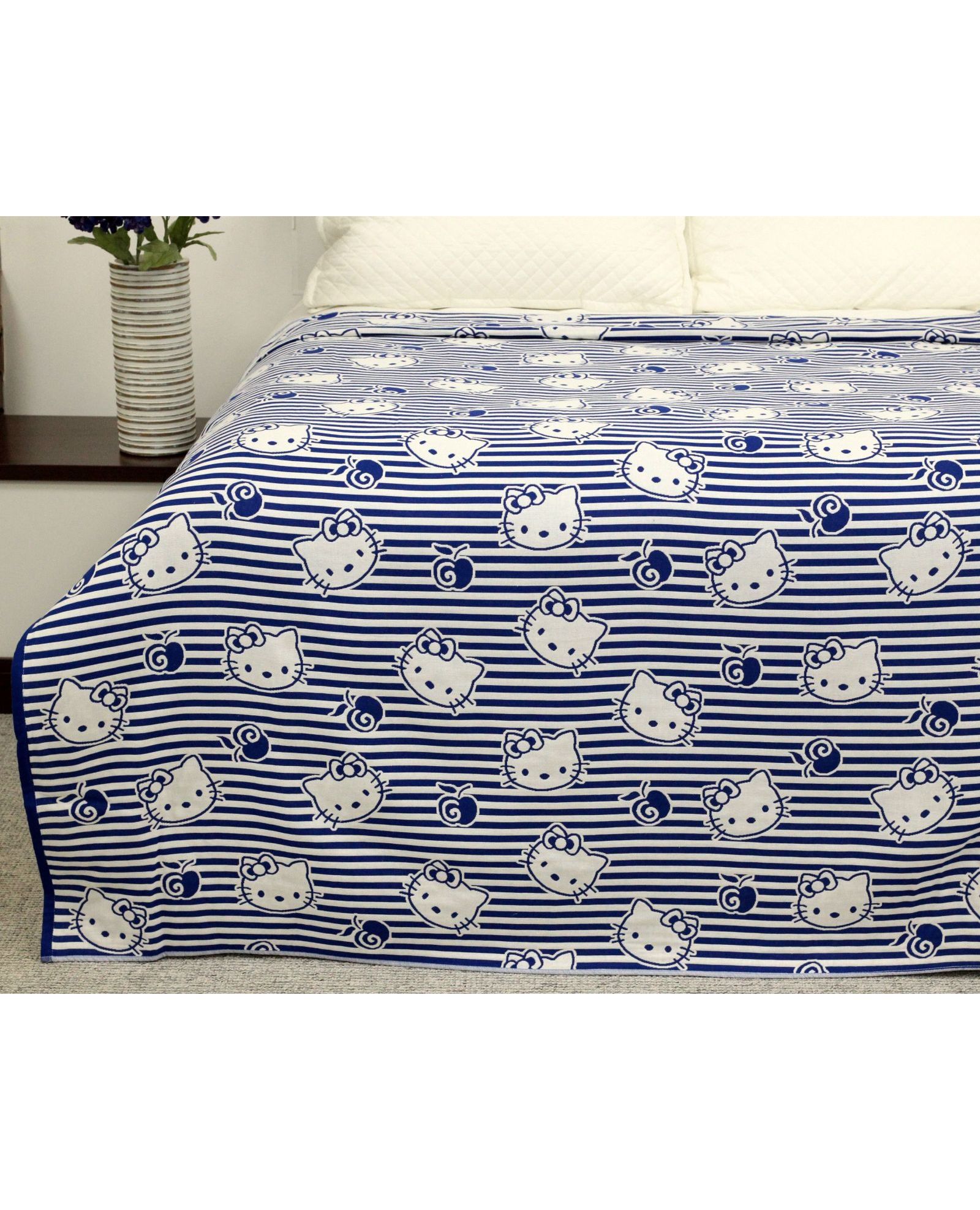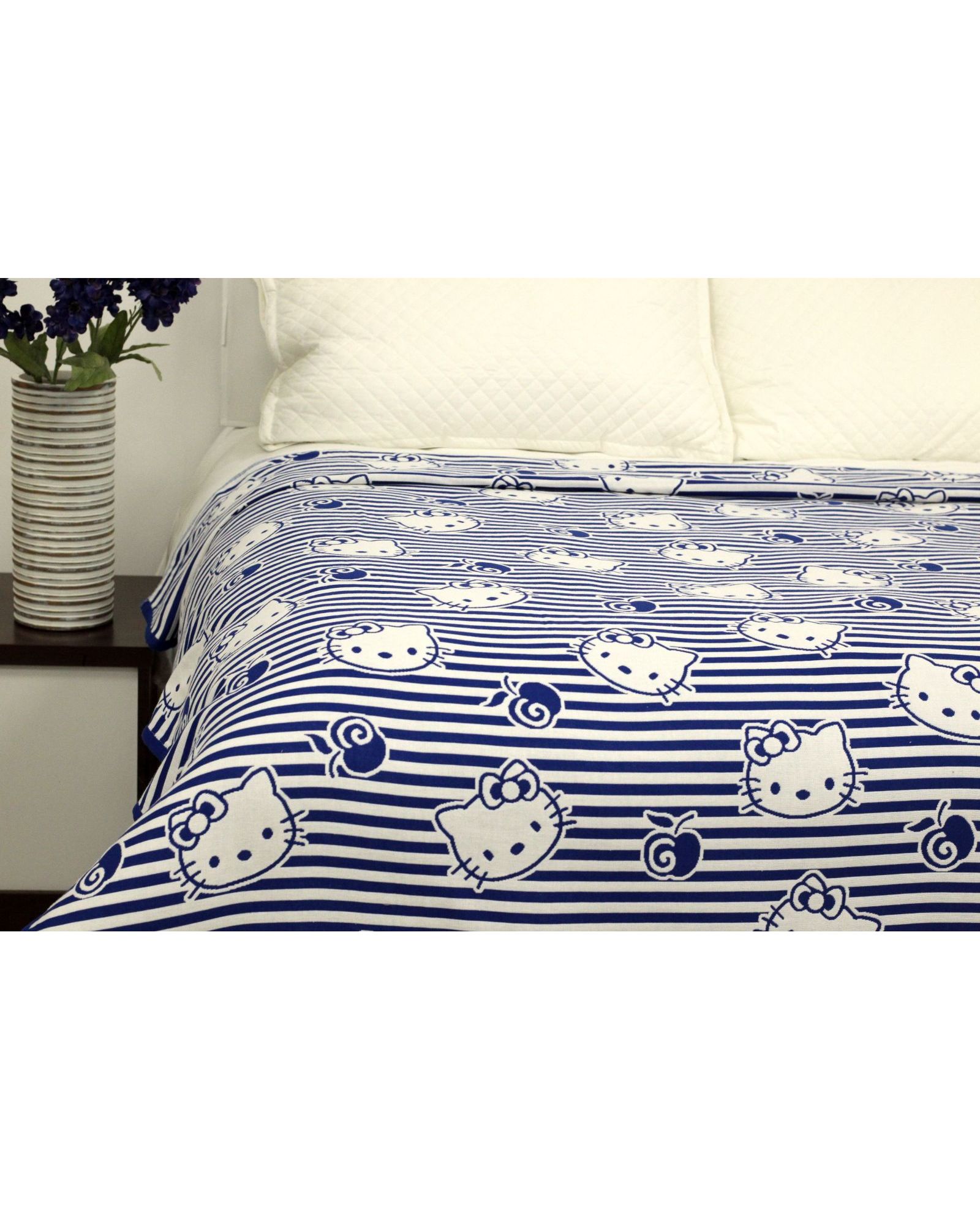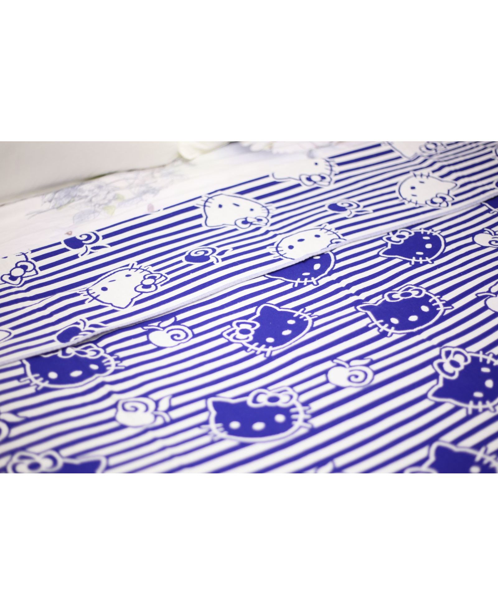 Покрывало 150×200 см белого цвета с синими полосками и изображением Hello Kitty