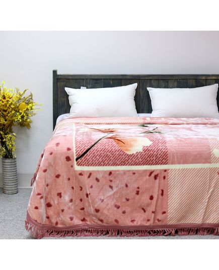 Плед UNO, 230×260 см, пудровый с цветочным рисунком и бахромой