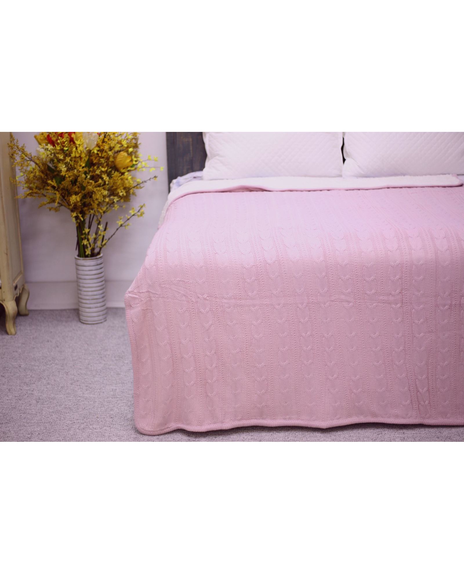 Уютное двустороннее покрывало сочетает элегантный вязаный дизайн и невероятно мягкую меховую текстуру. Лицевая сторона выполнена в пудровом цвете с узором в виде косички, что придает стильный вид. Обратная сторона – это белоснежный искусственный мех, который согреет в прохладное время года.