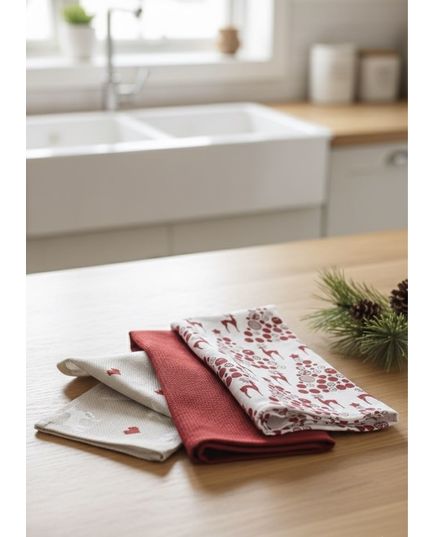 Практичный и стильный набор кухонных полотенец станет ярким акцентом вашей кухни в праздничный сезон. Натуральный хлопок отлично впитывает влагу и быстро сохнет.