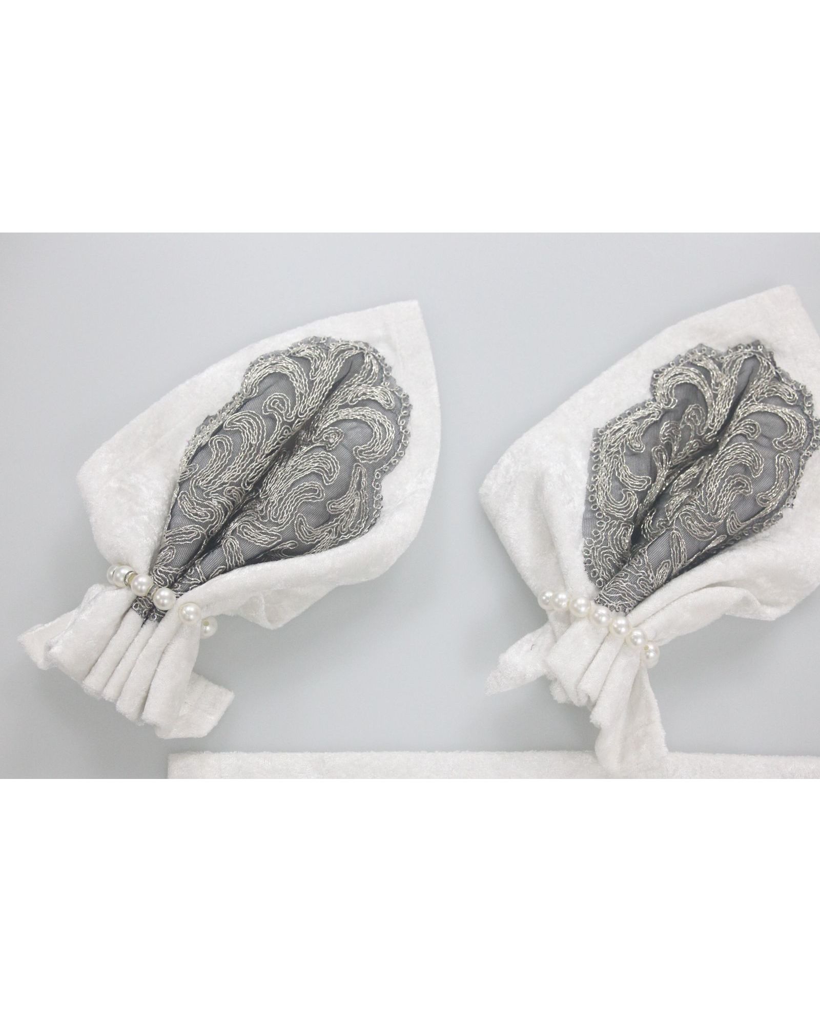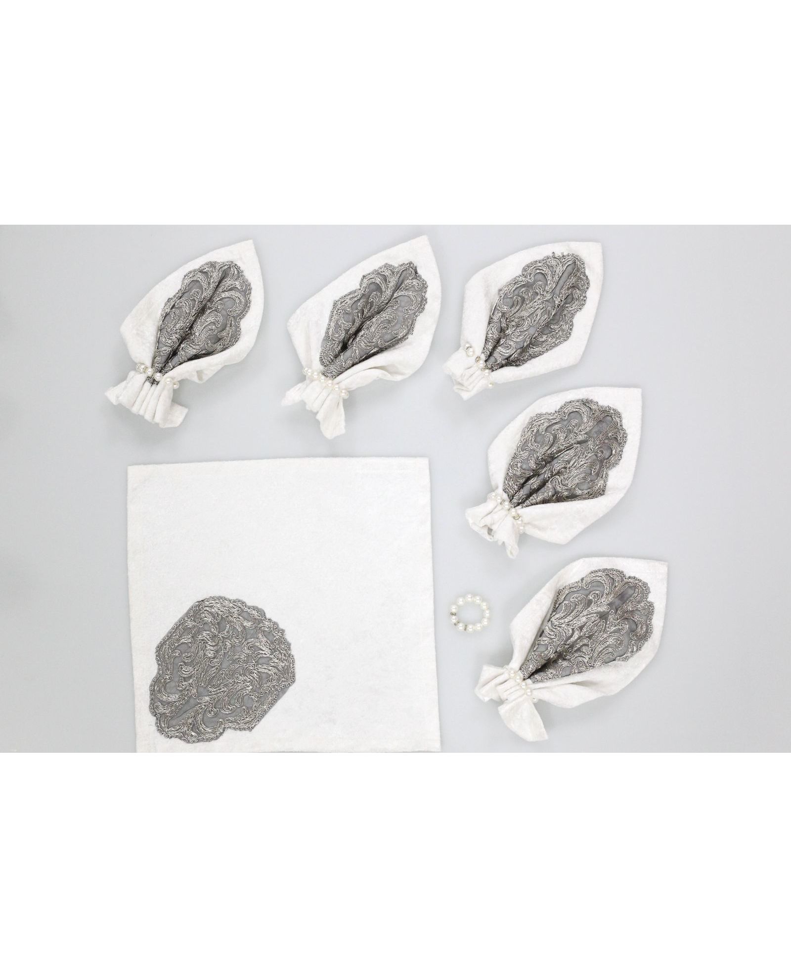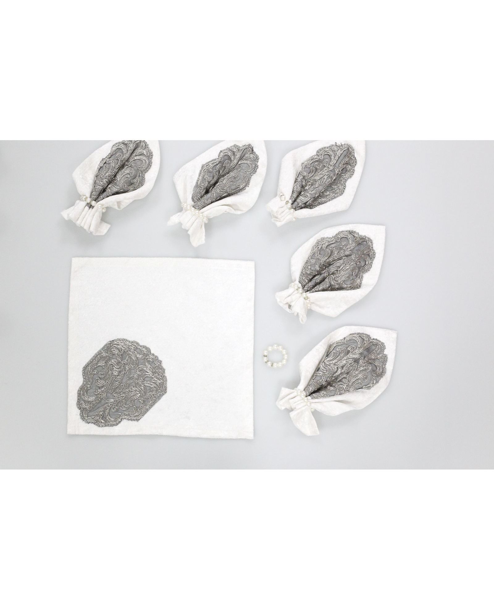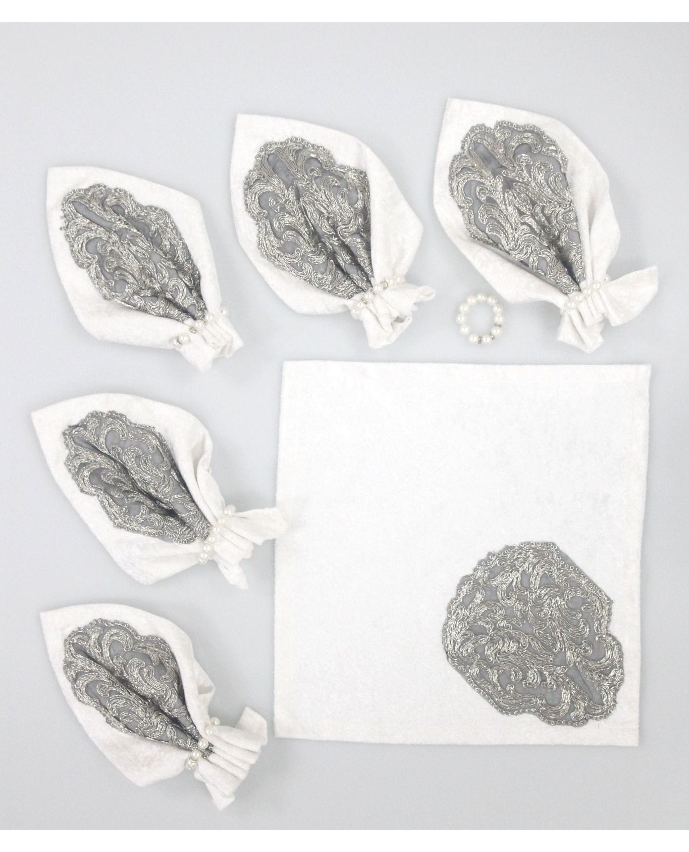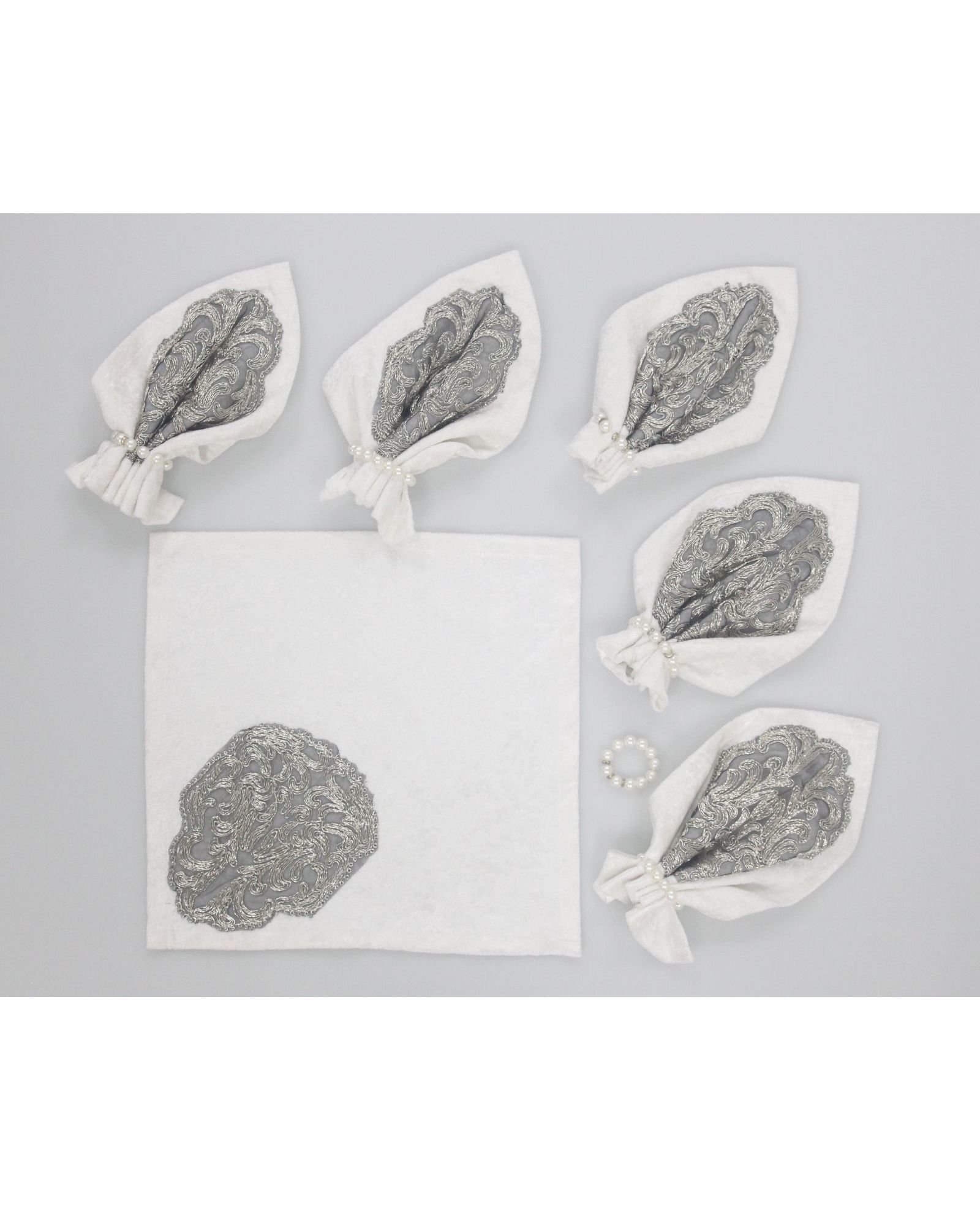 Набор из 6 салфеток размером 35×35 см — это утонченное решение для красивой сервировки. Белый бархат придает благородство, а изящная вышивка металлической нитью создаёт эффектный акцент. Идеально подойдут для торжественных мероприятий и праздничного стола.