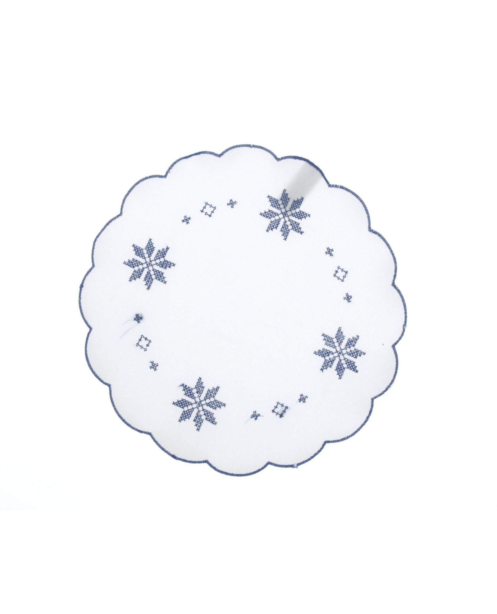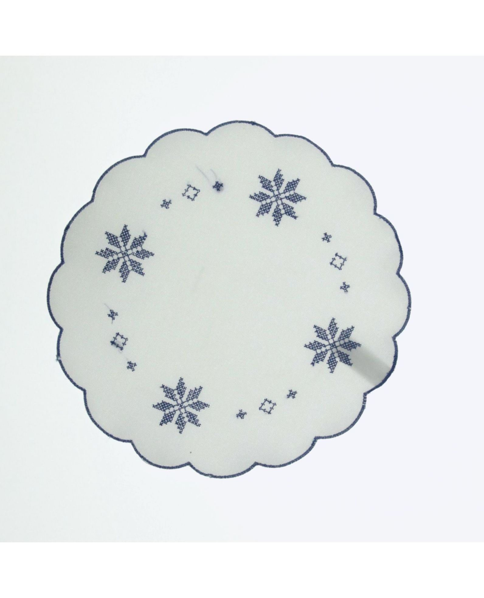 Нарядная салфетка размером 30х30 см выполнена в белом цвете и украшена изящной голубой вышивкой и волнистыми краями. Она прекрасно дополнит сервировку как праздничного, так и повседневного стола. Материал — 100% полиэстер — не требует складного ухода, сохраняет форму и аккуратный внешний вид.