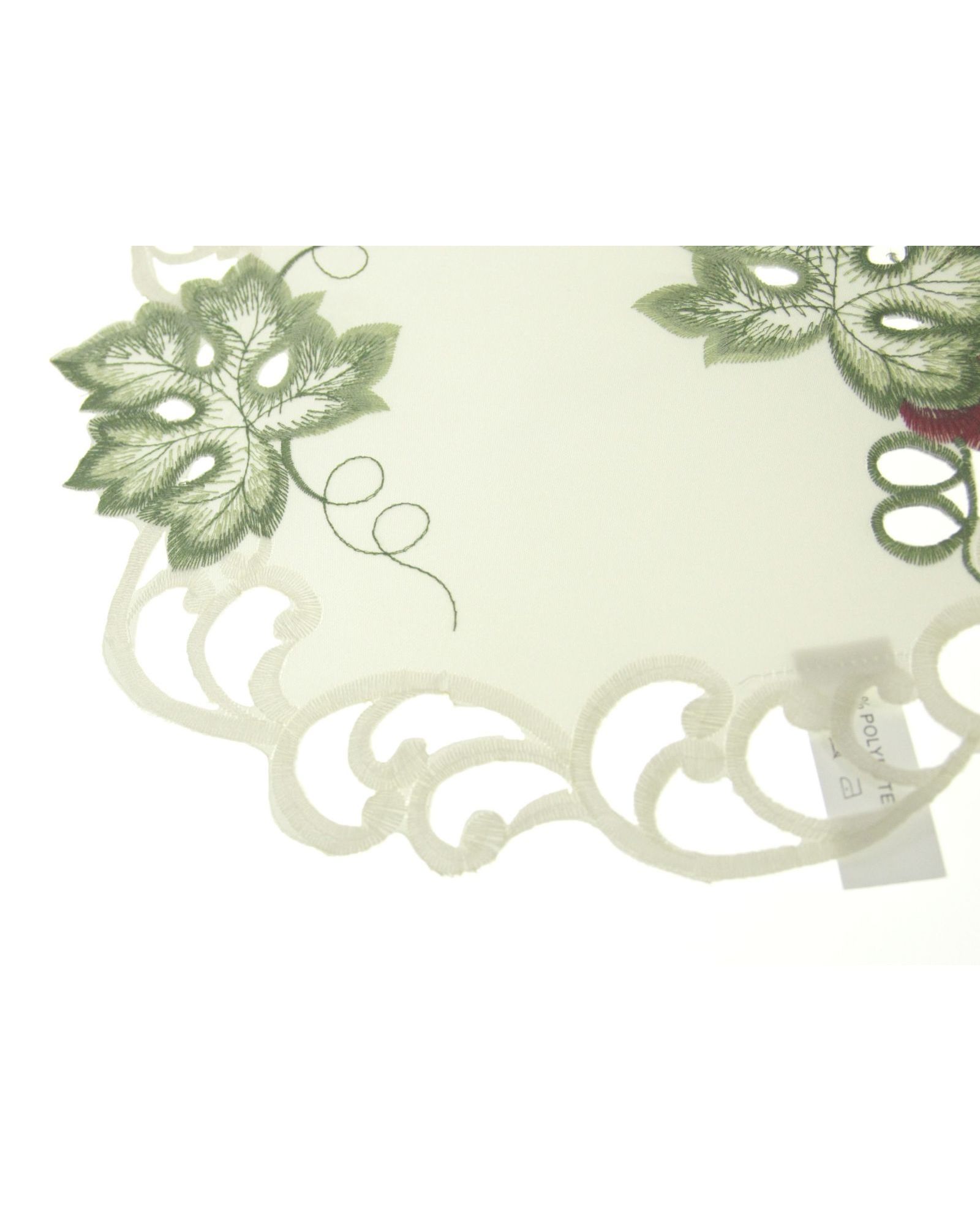 Изящная круглая салфетка молочного цвета украшена виноградной вышивкой и ажурной отделкой по краю. Она станет стильным акцентом на вашем столе и прекрасно подойдёт как для праздничной, так и для повседневной сервировки. Прочный материал гарантирует долговечность и удобство в уходе.