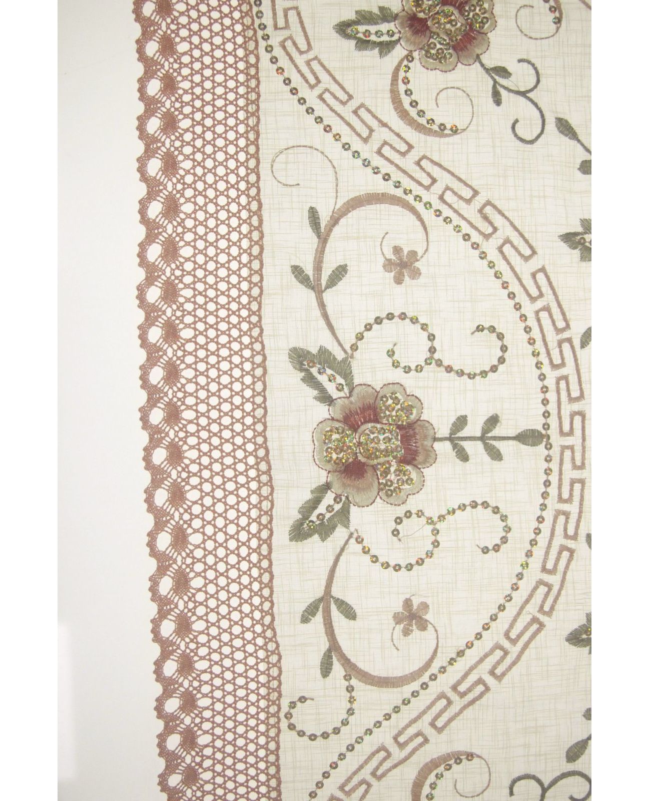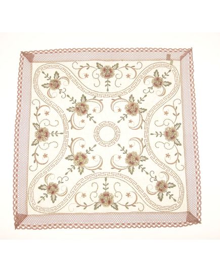 Эта бежевая салфетка размером 85х85 см украшена элегантной вышивкой, пайетками и изящным кружевом по краям. Она добавит утончённости и уюта любой сервировке, станет отличным выбором для торжеств и праздничных приёмов. Материал – 100% полиэстер – прочный, лёгкий в уходе и устойчивый к зносу.