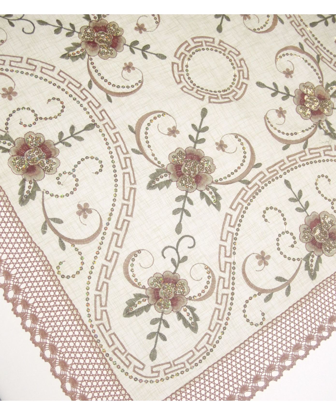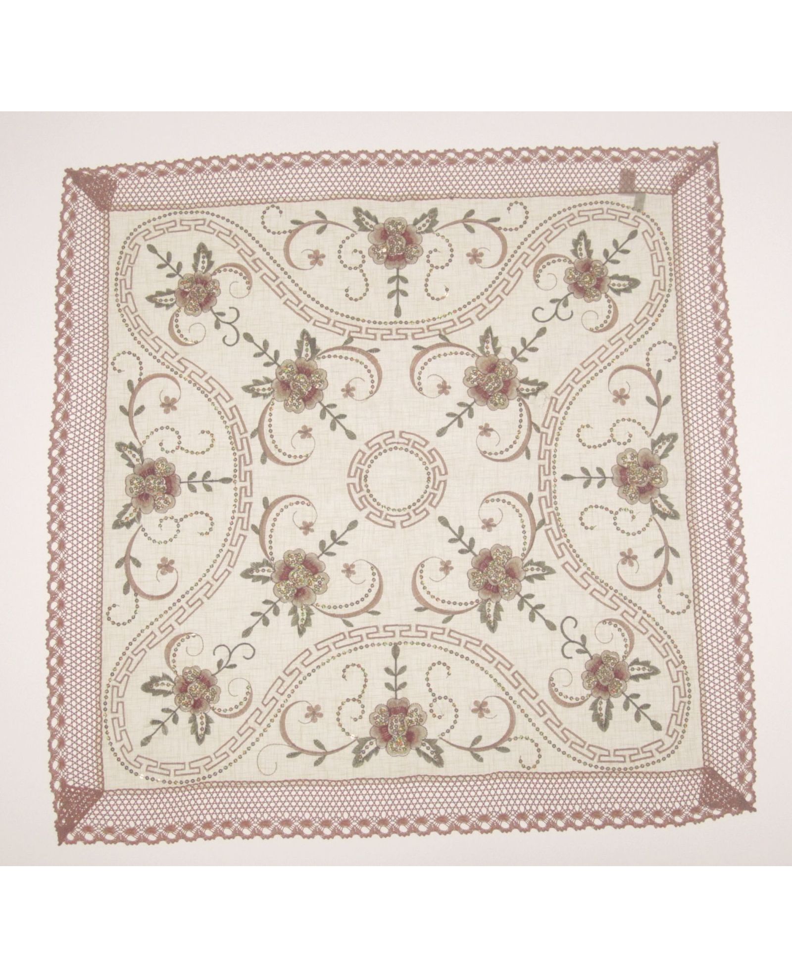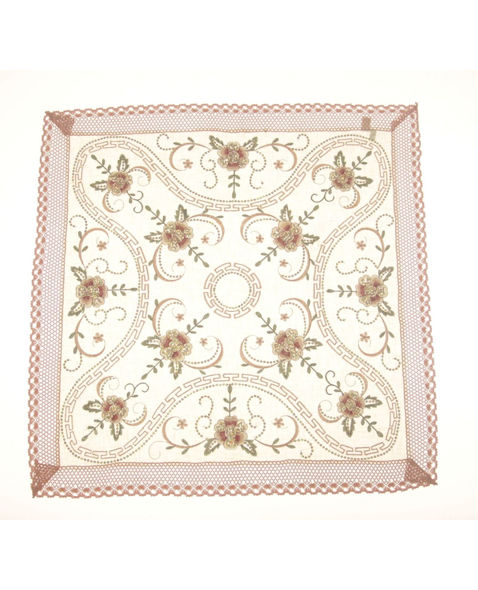 Салфетка бежевая с пайетками, вышивкой и кружевом по краям 85х85 см – изысканное украшение для сервировки