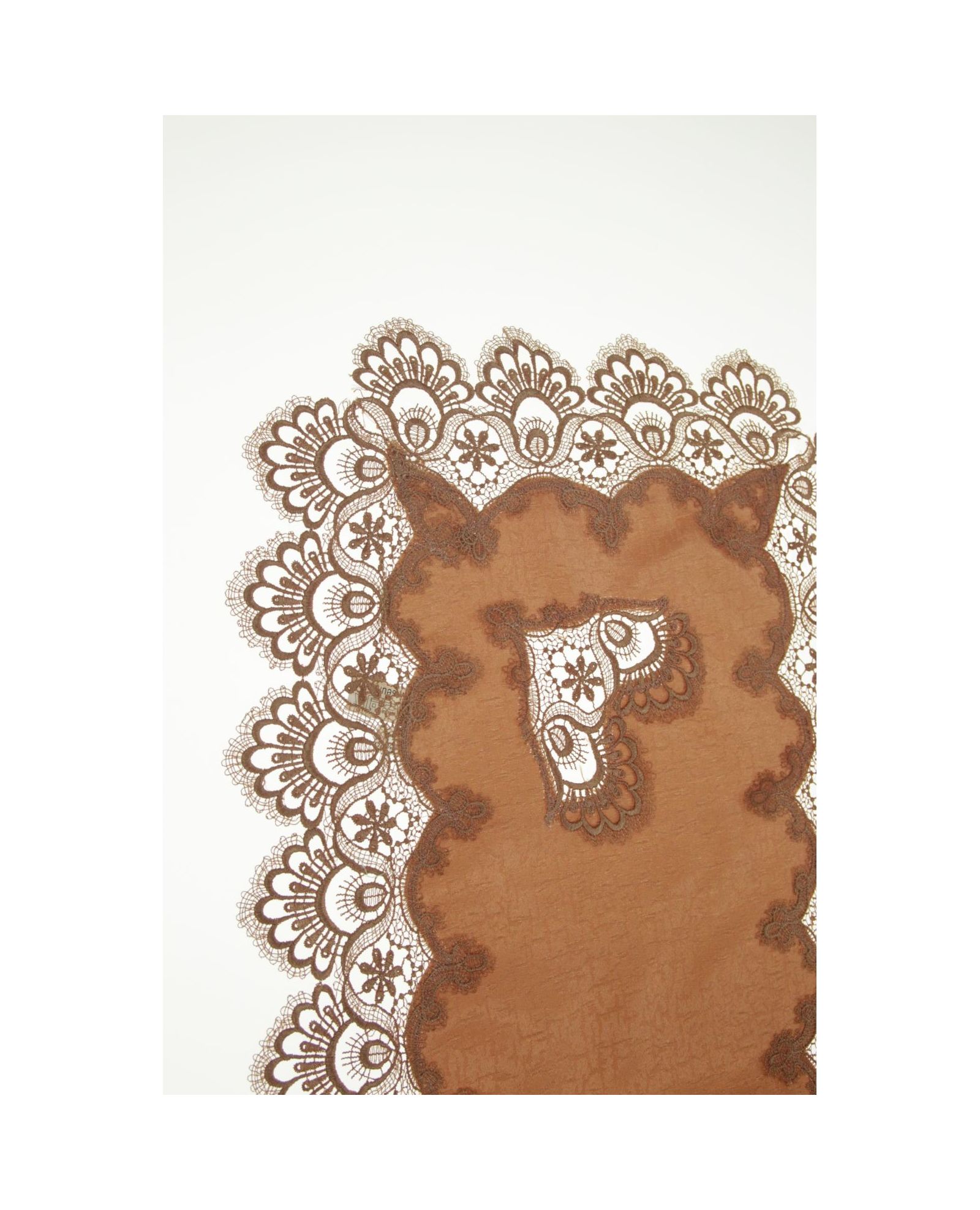 Удлинённая салфетка тёплого терракотового цвета с изящным кружевом станет акцентом, который оживит ваш интерьер. Она гармонично сочетается с натуральными оттенками и будет уместной как на повседневном, так и на праздничном столе. Изготовлена из прочного и лёгкого в уходе полиэстера.