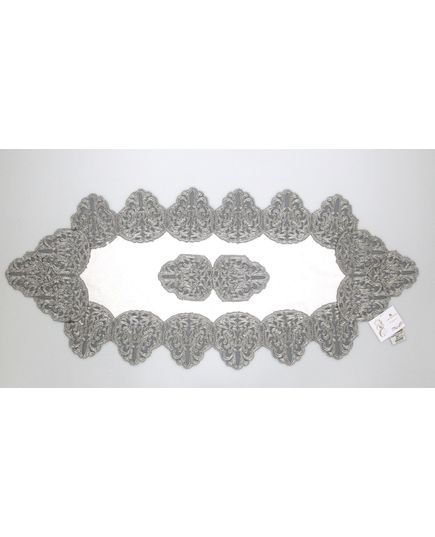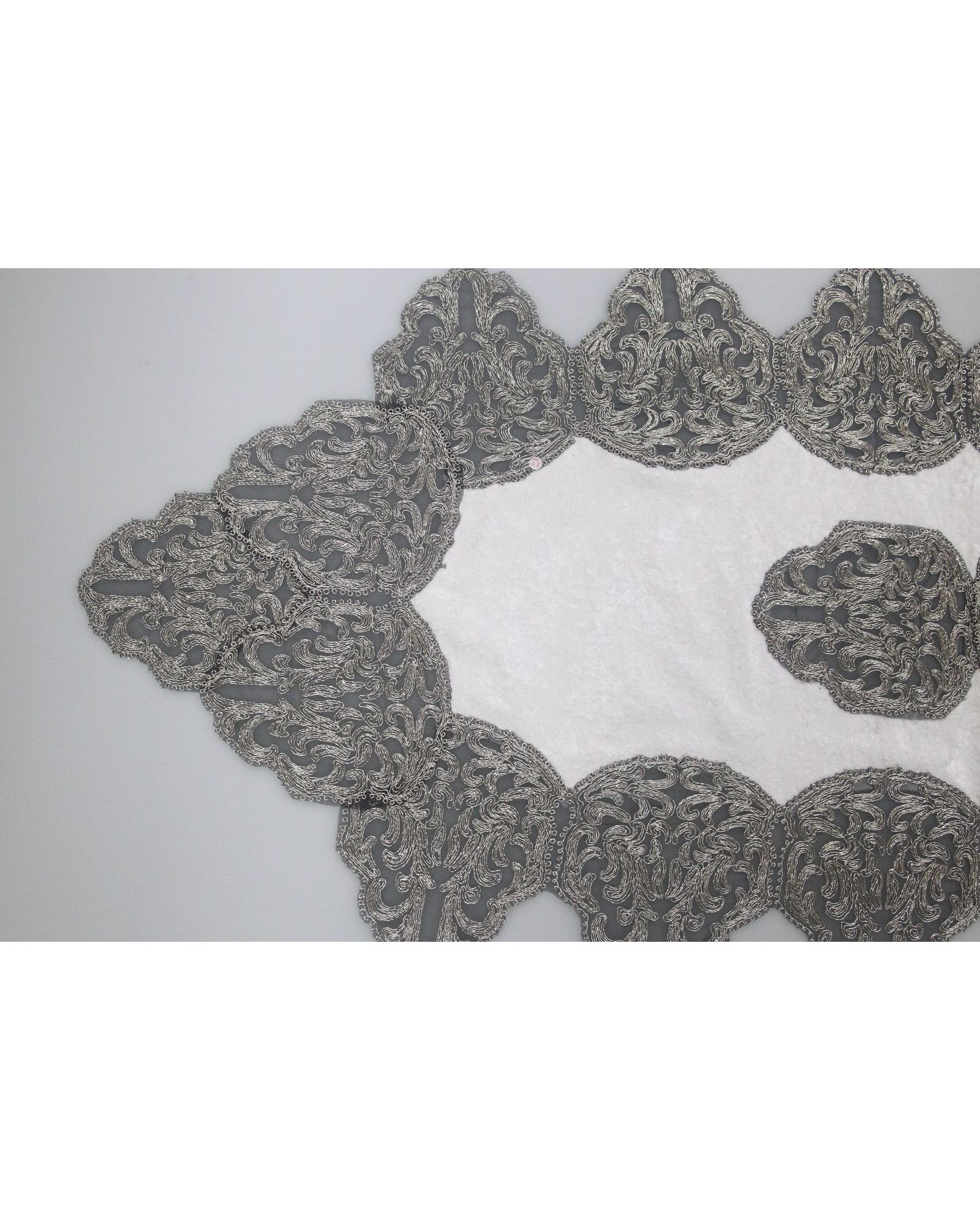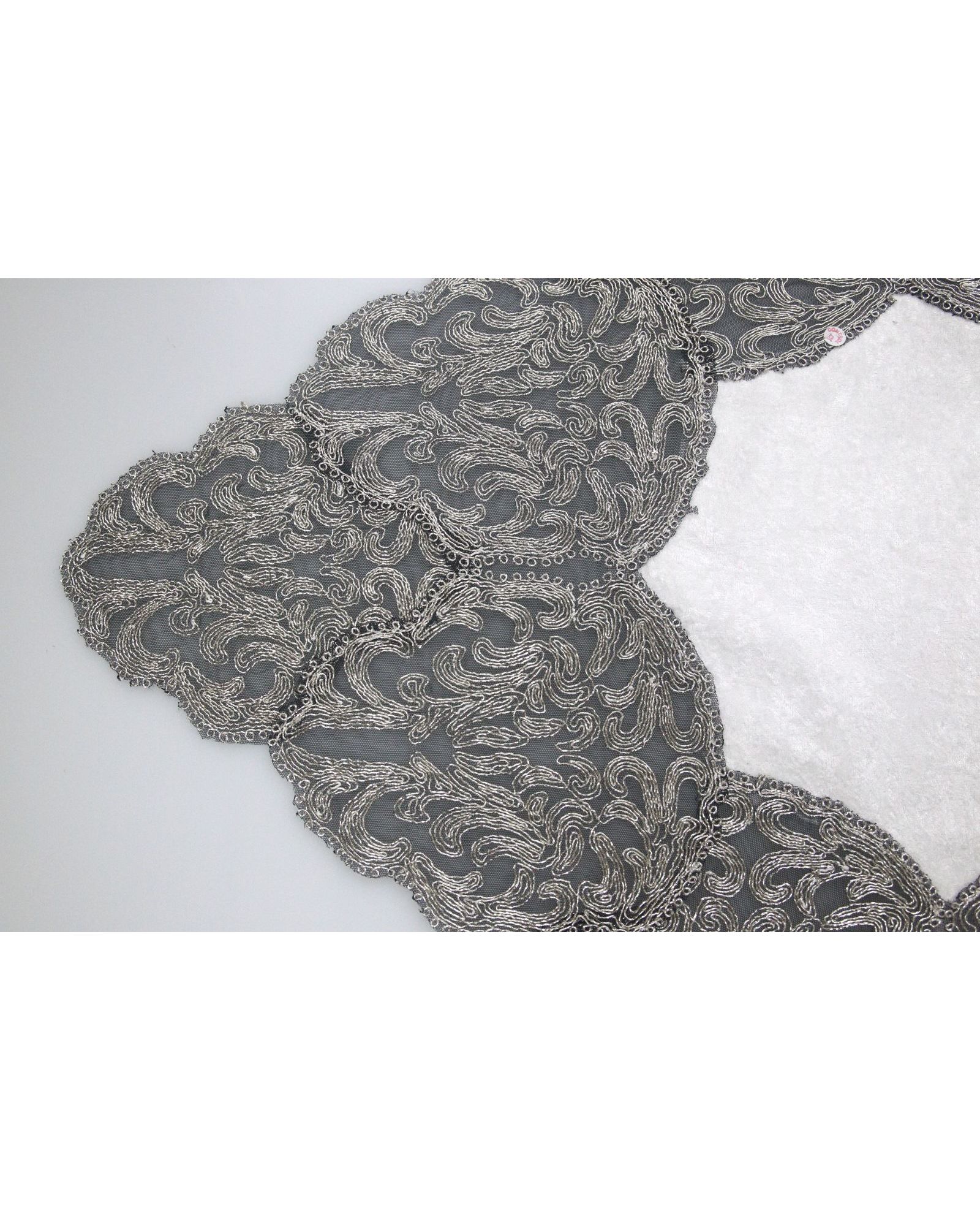 Изысканная салфетка размером 50х140 см выполнена из мягкого белого бархата. Украшена изящной вышивкой металлизированной нитью, придающей блеск и торжественность. Отлично подойдёт для сервировки стола в особые дни и на каждый день.