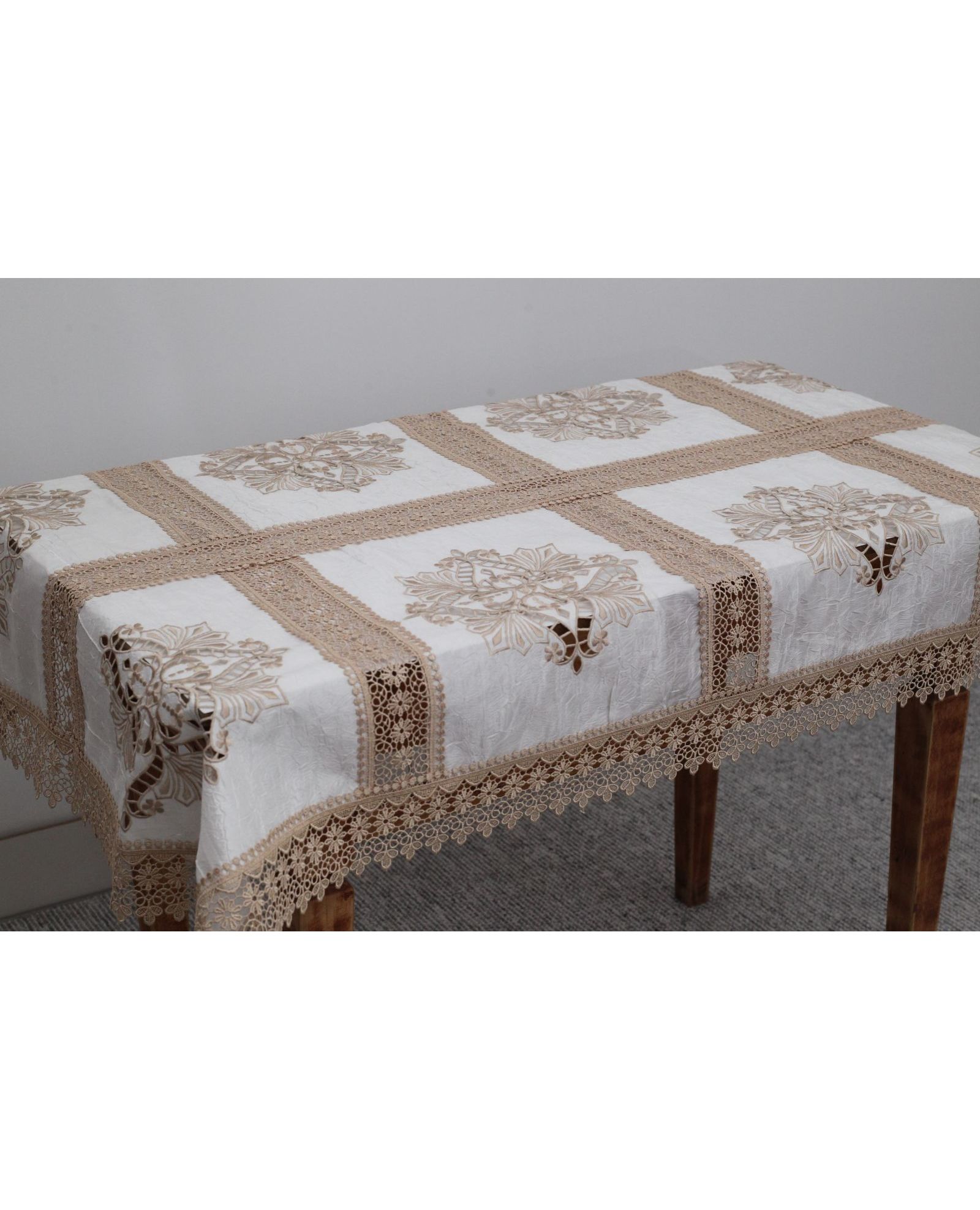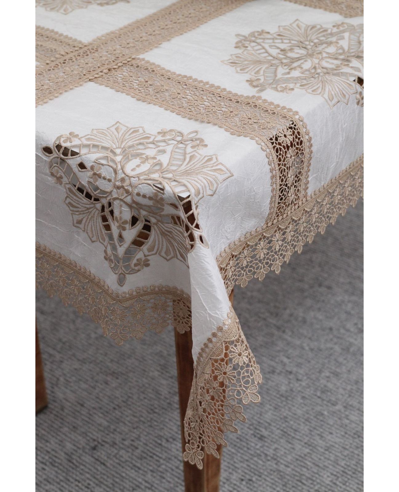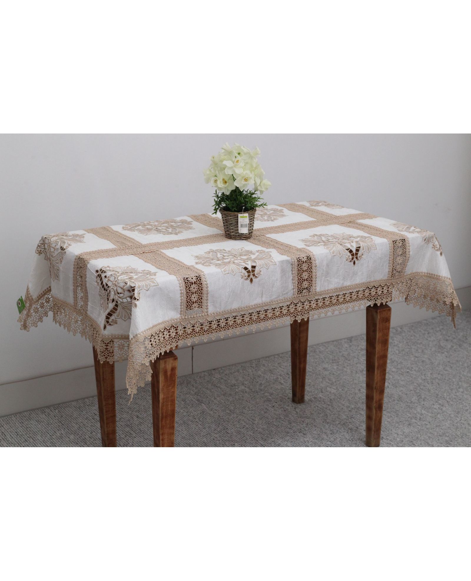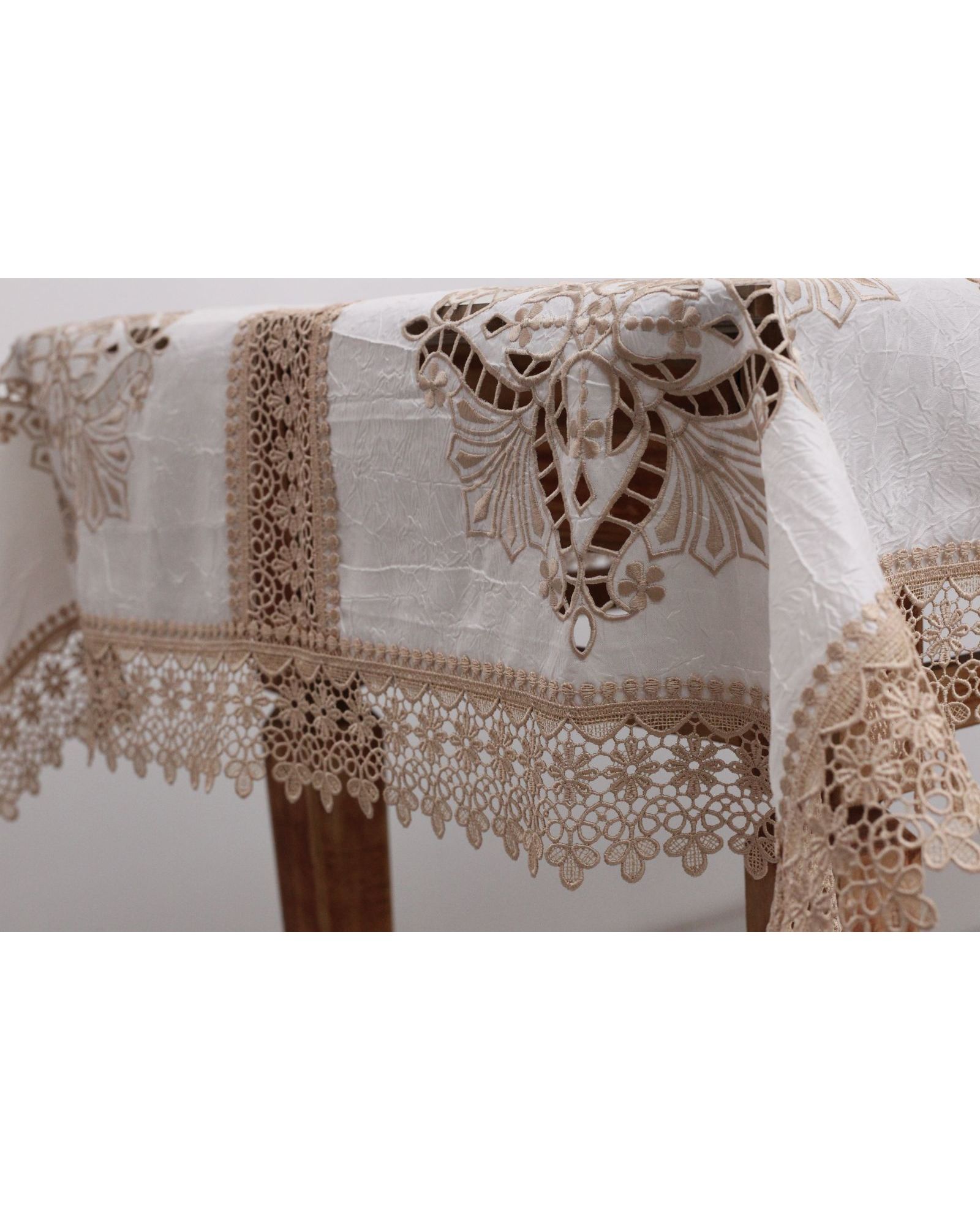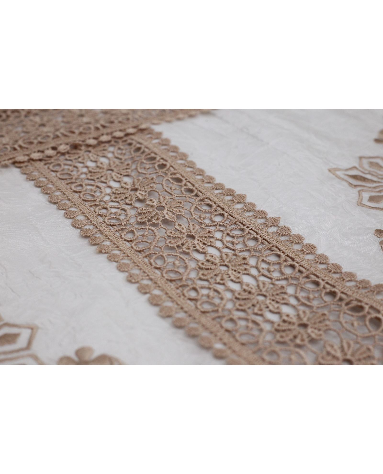 Скатерть 110×160 см, бежевого цвета с кружевной отделкой, полиэстер 100%