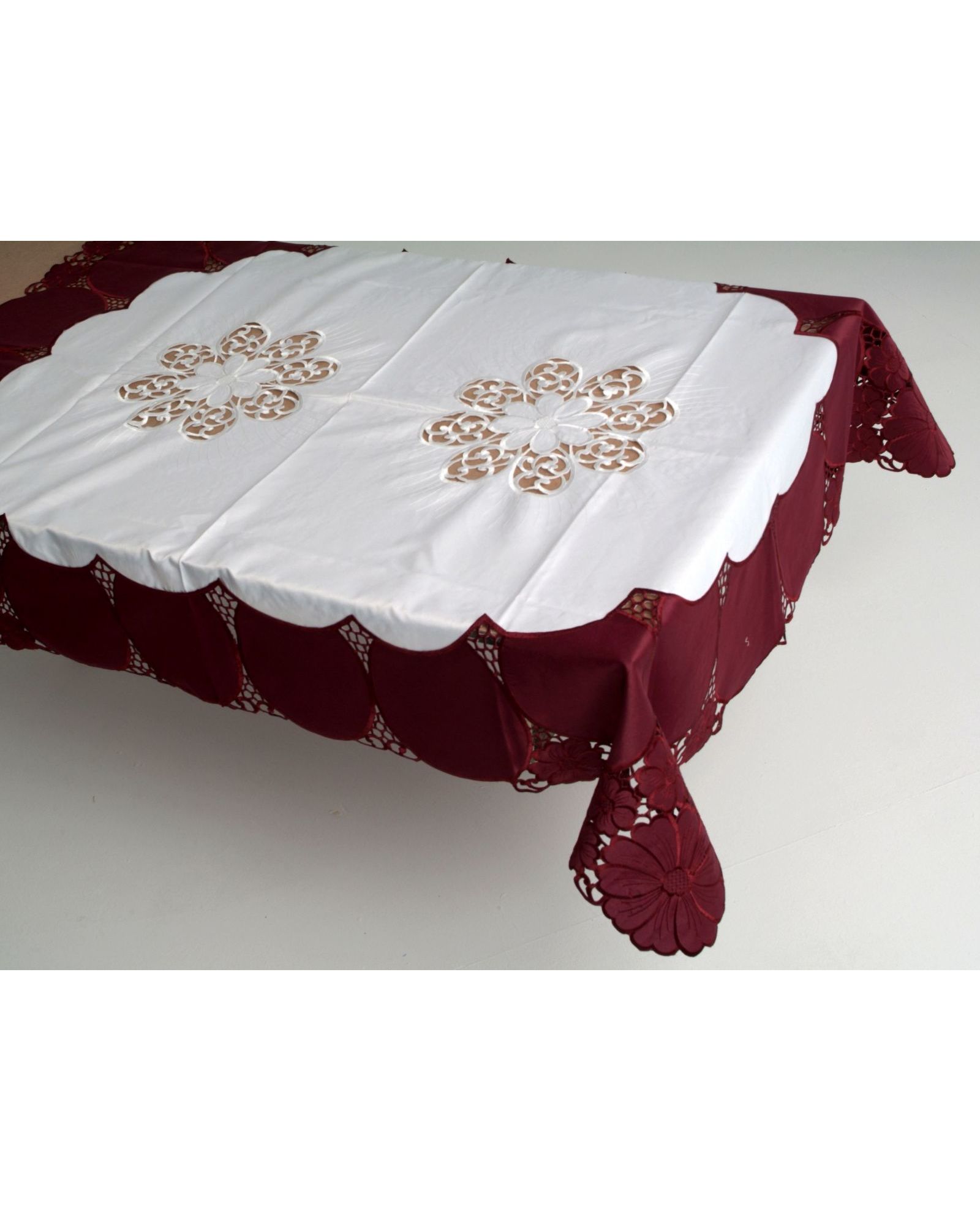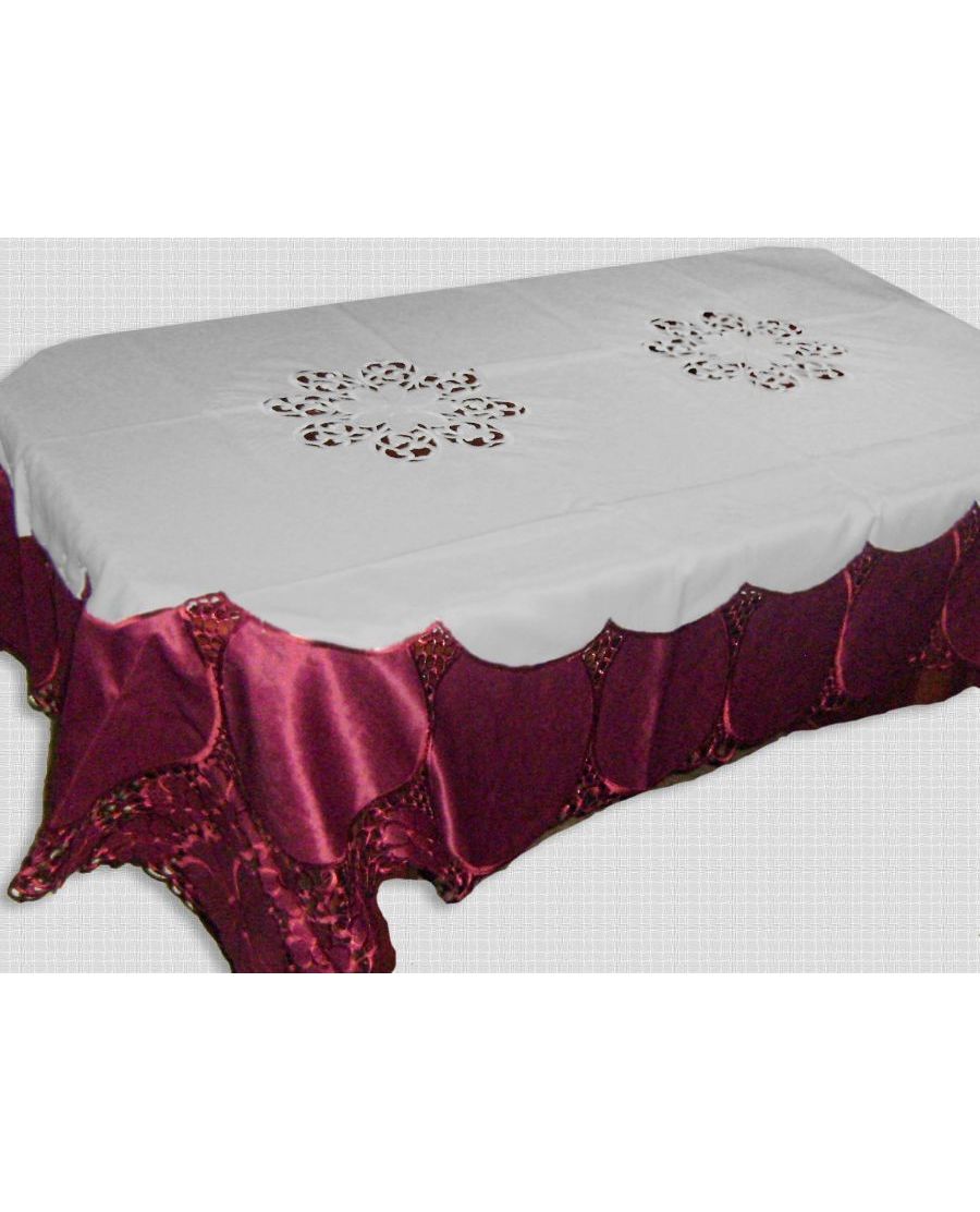 Скатерть белая с бордовыми краями и цветочной вышивкой