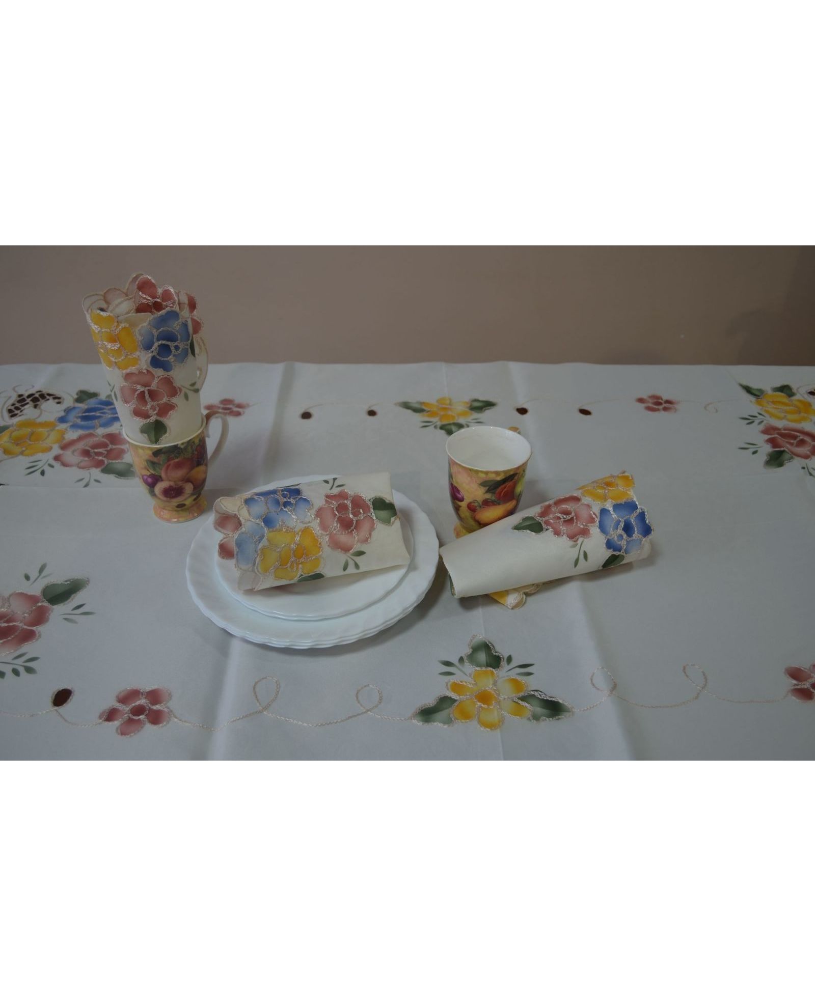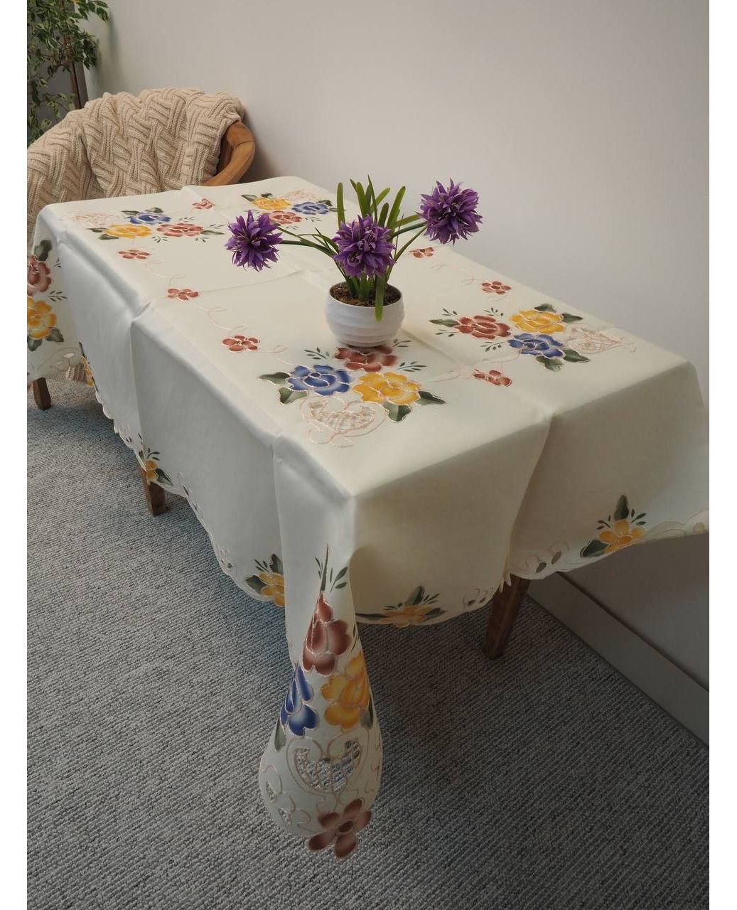 Скатерть молочного цвета с вышивкой цветов и волнистыми краями