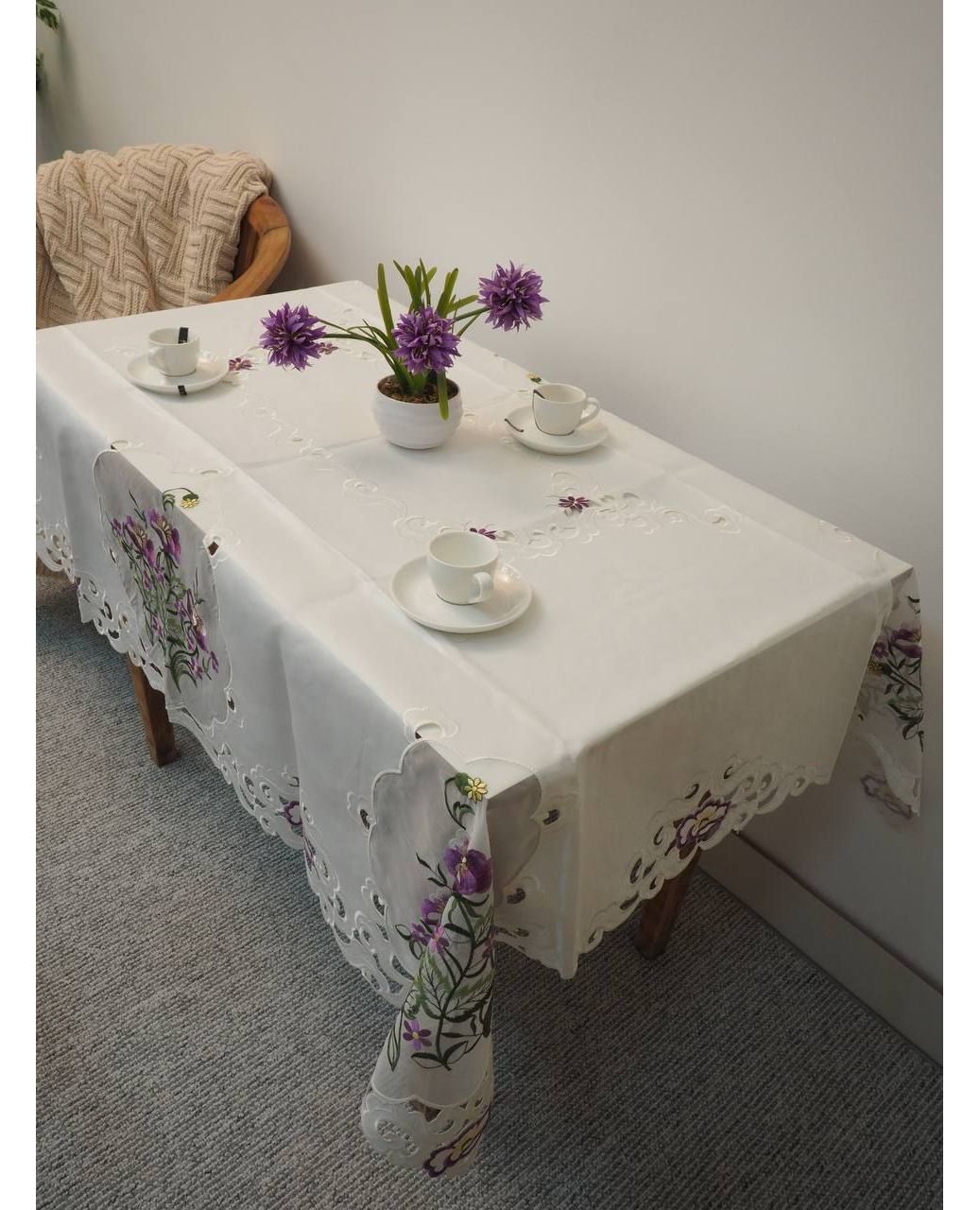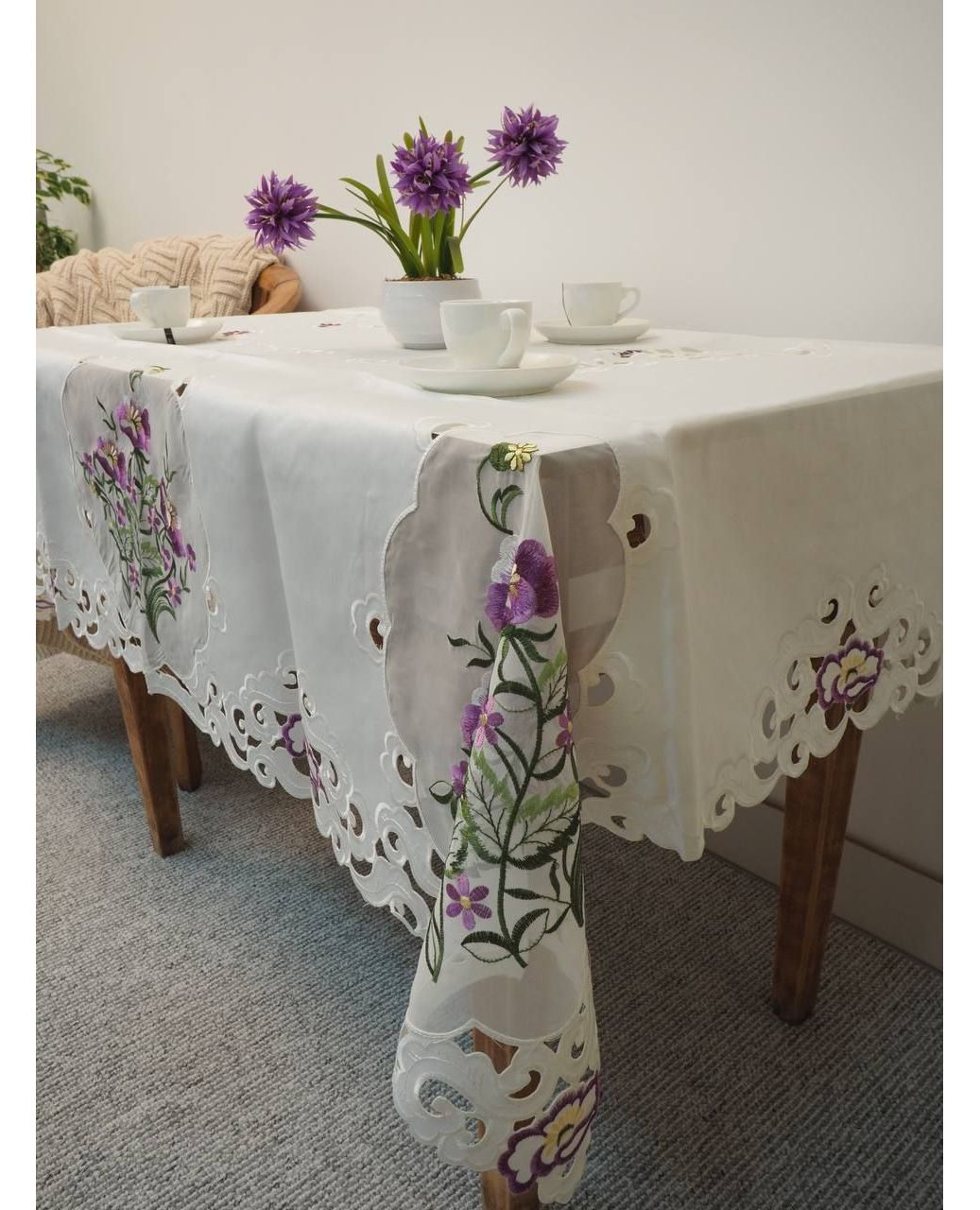 Элегантная скатерть белого цвета с утонченной вышивкой цветов станет прекрасным украшением вашего стола. Она придаст интерьеру изысканности и праздничной атмосферы. Благодаря 100% полиэстеру скатерть устойчива к износу, легко стирается и быстро высыхает, что делает её практичным выбором как для ежедневного использования, так и для особых случаев.
