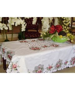 Скатерть белого цвета с вышитыми цветами Элегантная скатерть белого цвета с вышитыми цветами станет прекрасным дополнением вашего интерьера. Украшение в виде вышитых цветов в центре и на уголках придаёт изделию изысканность и особый шарм. Волнистые края добавляют нежности и лёгкости....