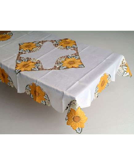 Белая скатерть 160х220 см с вышивкой подсолнухов и волнистыми краями — солнечный акцент для вашего стола
