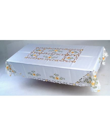 Белая скатерть 160х220 см с вышивкой подсолнухов и волнистыми краями — элегантность для вашего стола
