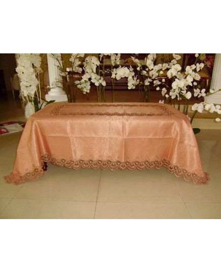 Скатерть 150х220 см украшена по середине и по краям кружевом с волнистыми краями, терракотового цвета, полиэстер 100% на прямоугольный стол