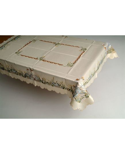 Бежевая скатерть 160х220 см с вышивкой лебедей и волнистыми краями — утонченность в каждой детали