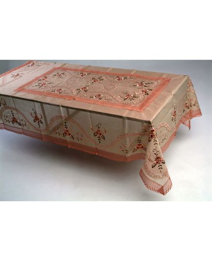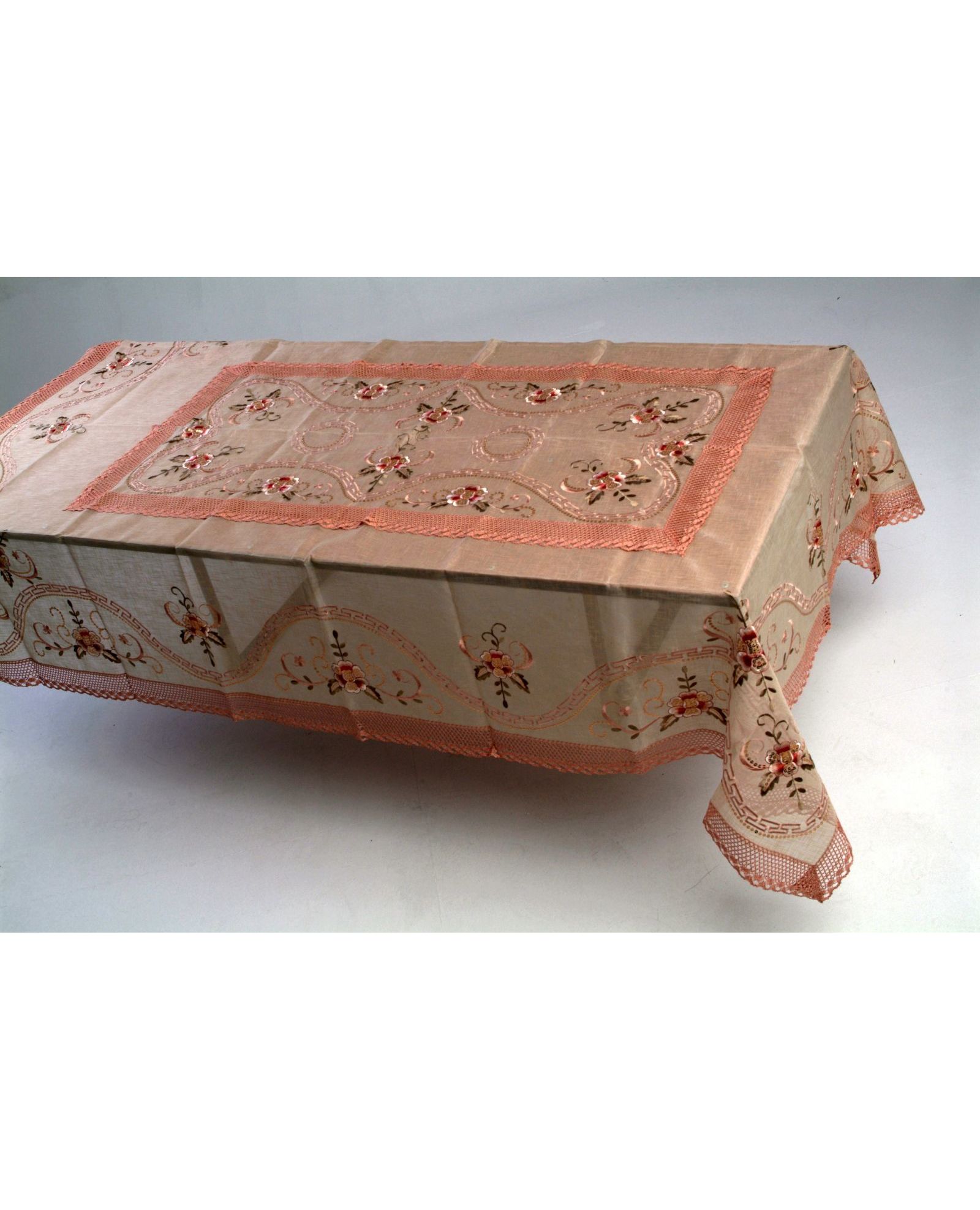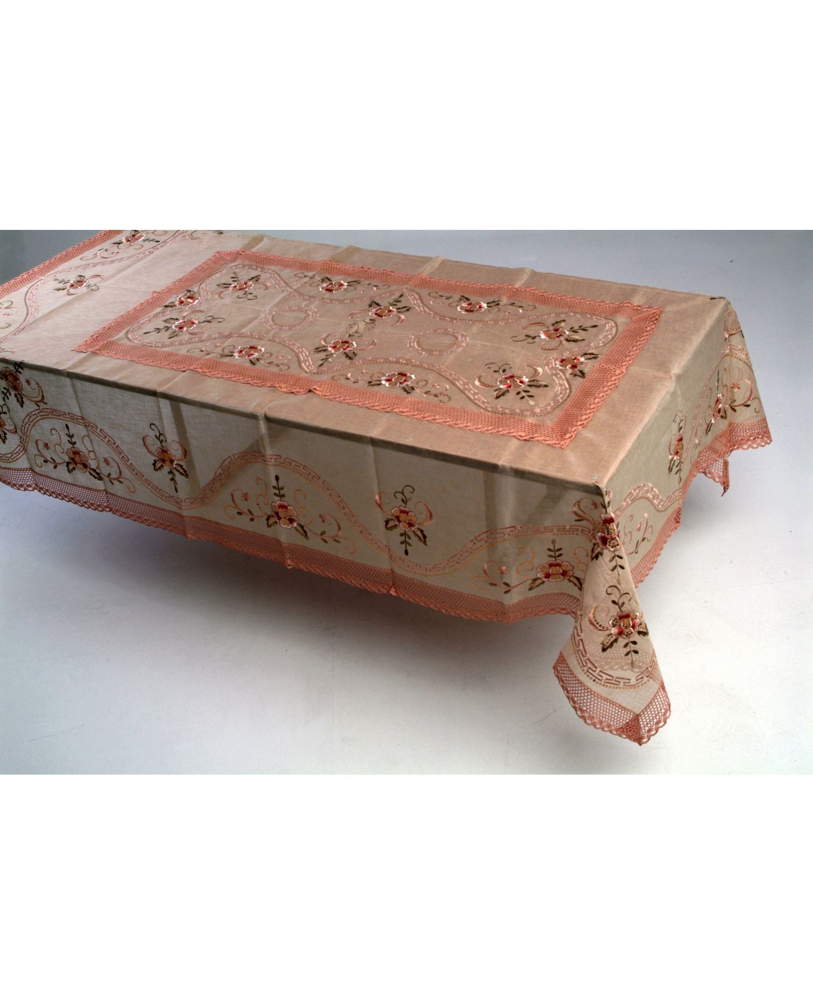 Скатерть 160х220 см с вышитыми цветами, украшена пайетками и кружевными краями, полиэстер 100%, бежевого цвета