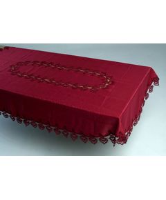 Скатерть 150х270 см украшена по середине и по краям кружевом с волнистыми краями, бордового цвета, полиэстер 100% на овальный стол Эта элегантная скатерть придаст роскошный вид вашему столу благодаря красивому бордовому цвету и нежному кружевному украшению по середине и краям....